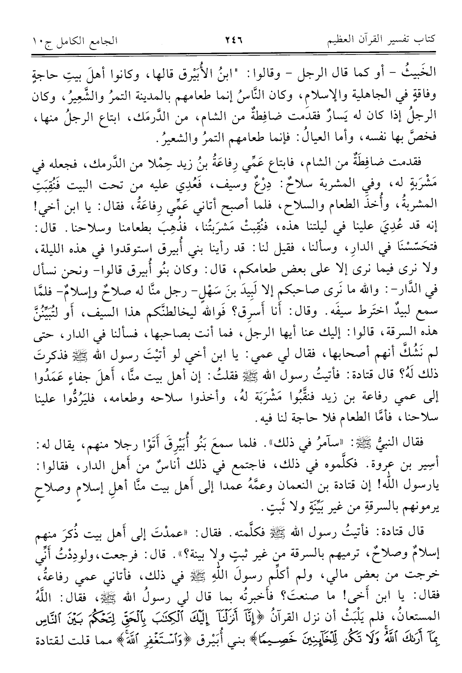 قال قتادة: فأتيتُ رسول اللَّه -صلى اللَّه عليه وسلم- فكلَّمته. فقال: "عمدْتَ إلى أَهل بيت ذُكرَ منهم إسلامٌ وصلاحٌ، ترميهم بالسرقة من غير ثبتٍ ولا بينة؟ ". قال: فرجعت، ولودِدْتُ أَنِّي خرجت من بعض مالي، ولم أكلِّم رسولَ اللَّهِ -صلى اللَّه عليه وسلم- في ذلك، فأتاني عمي رفاعةُ، فقال: يا ابن أَخى! ما صنعتَ؟ فأَخبرتُه بما قال لي رسولُ اللَّه -صلى اللَّه عليه وسلم-، فقال: اللَّهُ المستعانُ، فلم يَلْبَثْ أن نزل القرآنُ {إِنَّا أَنْزَلْنَا إِلَيْكَ الْكِتَابَ بِالْحَقِّ لِتَحْكُمَ بَيْنَ النَّاسِ بِمَا أَرَاكَ اللَّهُ وَلَا تَكُنْ لِلْخَائِنِينَ خَصِيمًا} بني أُبَيْرق {وَاسْتَغْفِرِ اللَّهَ} مما قلت لقتادة
