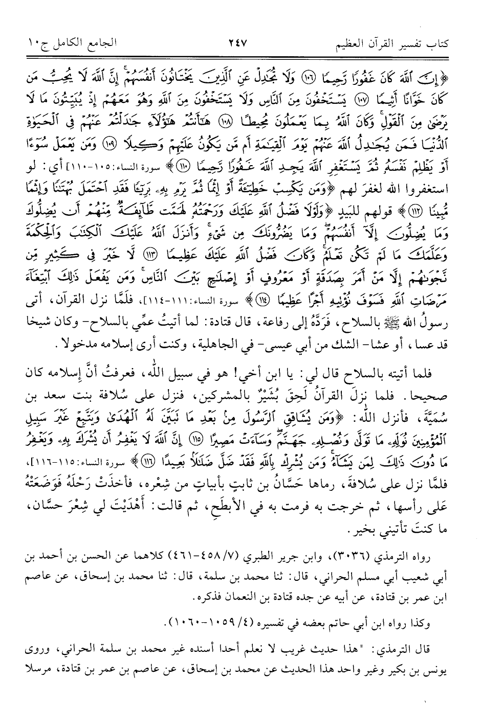 رواه الترمذيّ (٣٠٣٦)، وابن جرير الطبري (٧/ ٤٥٨ - ٤٦١) كلاهما عن الحسن بن أحمد بن أبي شعيب أبي مسلم الحراني، قال: ثنا محمد بن سلمة، قال: ثنا محمد بن إسحاق، عن عاصم ابن عمر بن قتادة، عن أبيه عن جده قتادة بن النعمان فذكره.