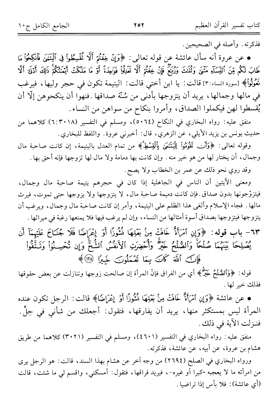 • عن عروة أنه سأل عائشة عن قوله تعالى: {وَإِنْ خِفْتُمْ أَلَّا تُقْسِطُوا فِي الْيَتَامَى فَانْكِحُوا مَا طَابَ لَكُمْ مِنَ النِّسَاءِ مَثْنَى وَثُلَاثَ وَرُبَاعَ فَإِنْ خِفْتُمْ أَلَّا تَعْدِلُوا فَوَاحِدَةً أَوْ مَا مَلَكَتْ أَيْمَانُكُمْ ذَلِكَ أَدْنَى أَلَّا تَعُولُوا} [سورة النساء: ٣] قالت: يا ابن أختي قالت: اليتيمة تكون في حجر وليها، فيرغب في مالها وجمالها، يريد أن يتزوجها بأدنى من سُنّة صداقها. فنهوا أن ينكحوهن إلّا أن يُقسطوا لهن فيكملوا الصداق، وأمروا بنكاح من سواهن من النساء.