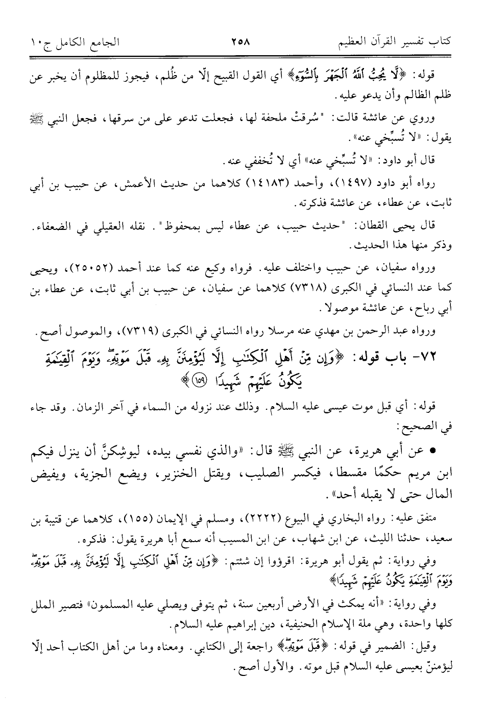 ٧٢ - باب قوله: {وَإِنْ مِنْ أَهْلِ الْكِتَابِ إِلَّا لَيُؤْمِنَنَّ بِهِ قَبْلَ مَوْتِهِ وَيَوْمَ الْقِيَامَةِ يَكُونُ عَلَيْهِمْ شَهِيدًا (١٥٩)}