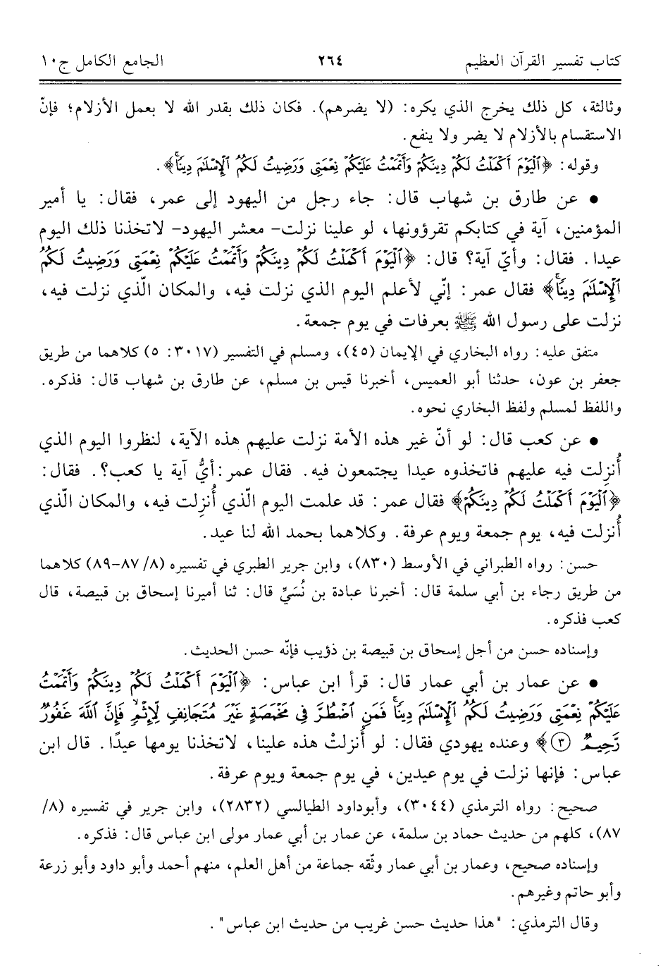 • عن طارق بن شهاب قال: جاء رجل من اليهود إلى عمر، فقال: يا أمير المؤمنين، آية في كتابكم تقرؤونها، لو علينا نزلت -معشر اليهود- لاتخذنا ذلك اليوم عيدا. فقال: وأيّ آية؟ قال: {الْيَوْمَ أَكْمَلْتُ لَكُمْ دِينَكُمْ وَأَتْمَمْتُ عَلَيْكُمْ نِعْمَتِي وَرَضِيتُ لَكُمُ الْإِسْلَامَ دِينًا} فقال عمر: إنّي لأعلم اليوم الذي نزلت فيه، والمكان الّذي نزلت فيه، نزلت على رسول اللَّه -صلى اللَّه عليه وسلم- بعرفات في يوم جمعة.