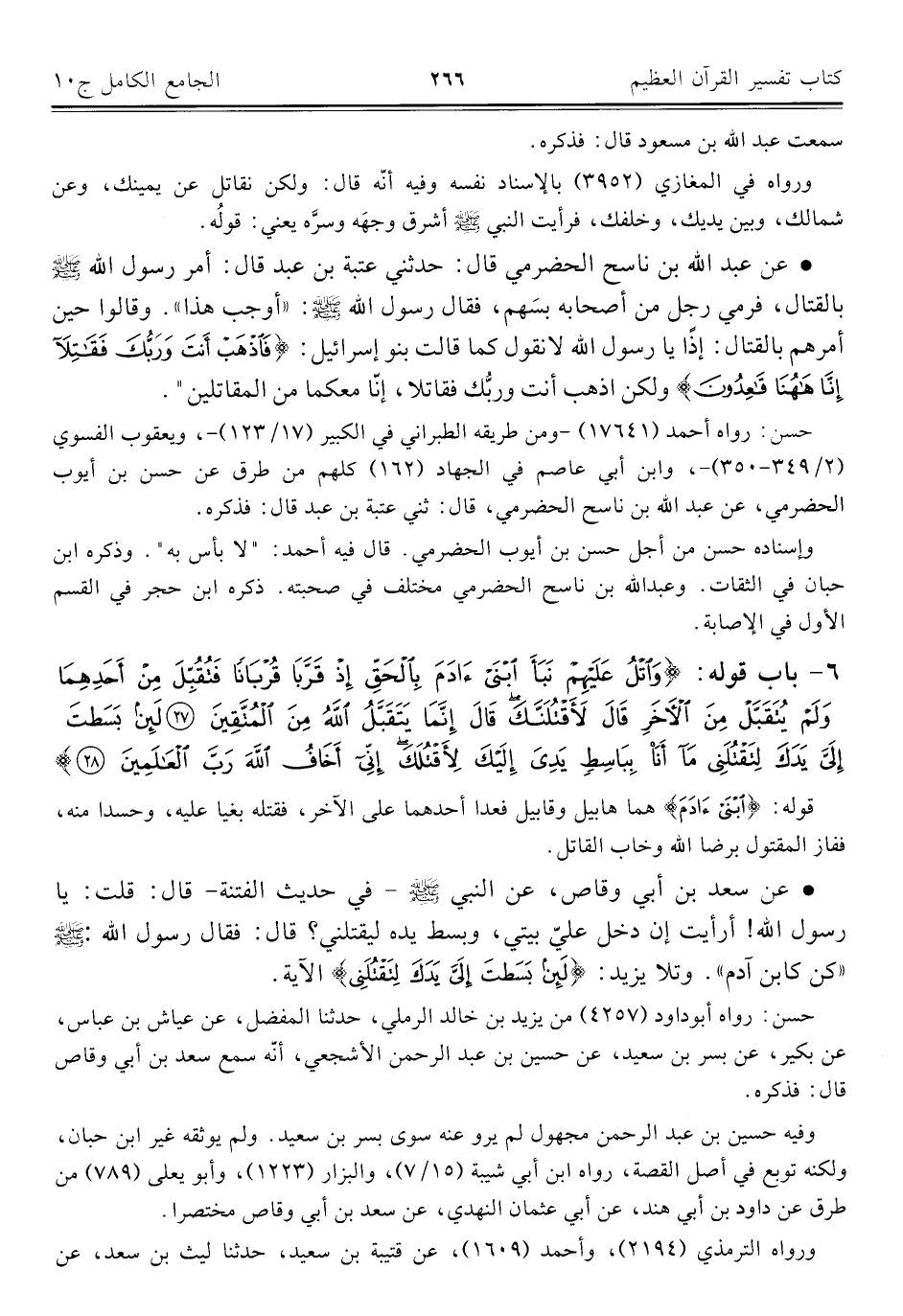 • عن سعد بن أبي وقاص، عن النبي -صلى اللَّه عليه وسلم- في حديث الفتنة- قال: قلت: يا رسول اللَّه! أرأيت إن دخل عليّ بيتي، وبسط يده ليقتلني؟ قال: فقال رسول اللَّه -صلى اللَّه عليه وسلم-: "كن كابن آدم". وتلا يزيد: {لَئِنْ بَسَطْتَ إِلَيَّ يَدَكَ لِتَقْتُلَنِي} الآية.