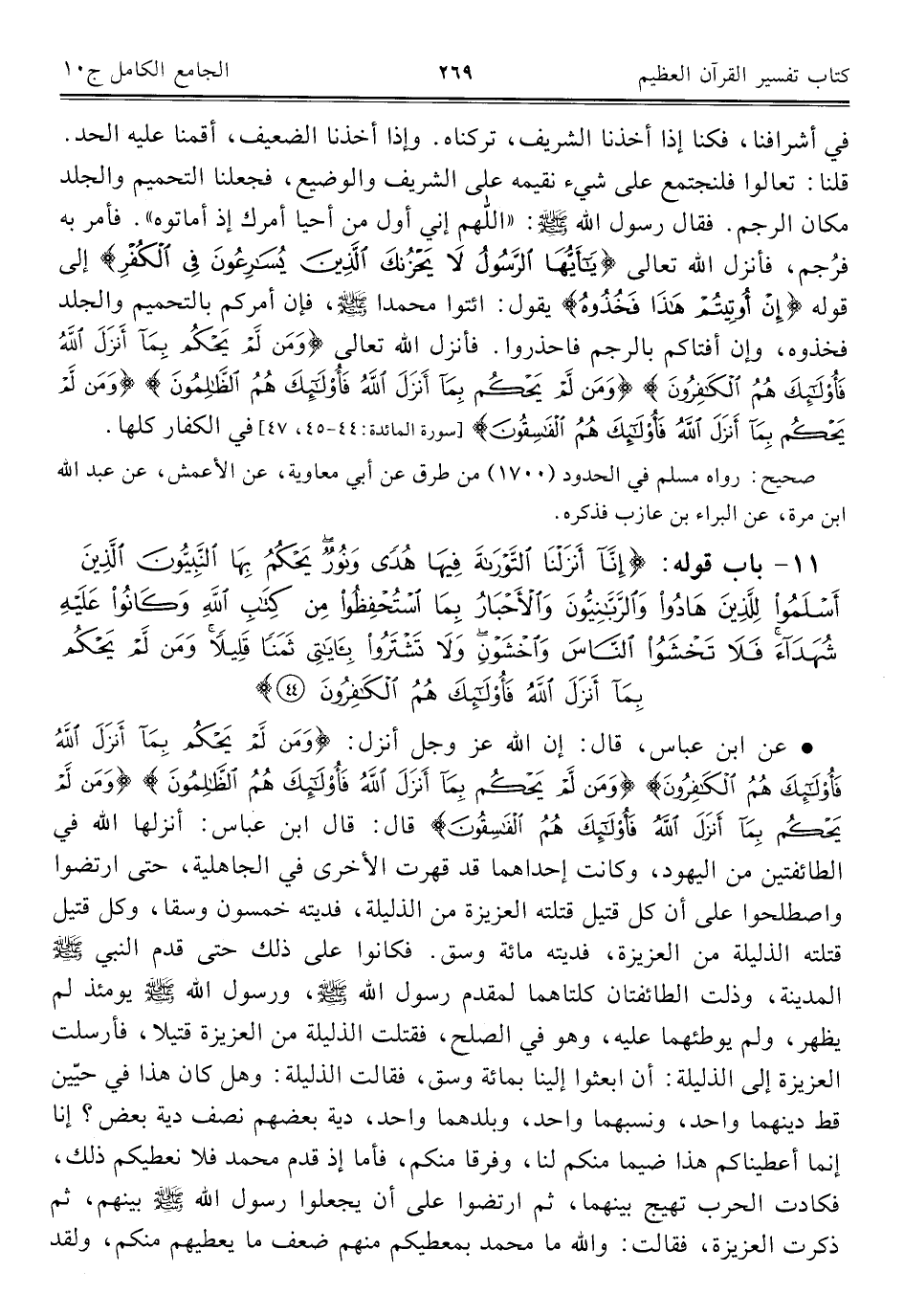 • عن ابن عباس، قال: إن اللَّه عز وجل أنزل: {وَمَنْ لَمْ يَحْكُمْ بِمَا أَنْزَلَ اللَّهُ فَأُولَئِكَ هُمُ الْكَافِرُونَ} {وَمَنْ لَمْ يَحْكُمْ بِمَا أَنْزَلَ اللَّهُ فَأُولَئِكَ هُمُ الظَّالِمُونَ} {وَمَنْ لَمْ يَحْكُمْ بِمَا أَنْزَلَ اللَّهُ فَأُولَئِكَ هُمُ الْفَاسِقُونَ} قال: قال ابن عباس: أنزلها اللَّه في الطائفتين من اليهود، وكانت إحداهما قد قهرت الأخرى في الجاهلية، حتى ارتضوا واصطلحوا على أن كل قتيل قتلته العزيزة من الذليلة، فديته خمسون وسقا، وكل قتيل قتلته الذليلة من العزيزة، فديته مائة وسق. فكانوا على ذلك حتى قدم النبي -صلى اللَّه عليه وسلم- المدينة، وذلت الطائفتان كلتاهما لمقدم رسول اللَّه -صلى اللَّه عليه وسلم-، ورسول اللَّه -صلى اللَّه عليه وسلم- يومئذ لم يظهر، ولم يوطئهما عليه، وهو في الصلح، فقتلت الذليلة من العزيزة قتيلا، فأرسلت العزيزة إلى الذليلة: أن ابعثوا إلينا بمائة وسق، فقالت الذليلة: وهل كان هذا في حيّين قط دينهما واحد، ونسبهما واحد، وبلدهما واحد، دية بعضهم نصف دية بعض؟ إنا إنما أعطيناكم هذا ضيما منكم لنا، وفرقا منكم، فأما إذ قدم محمد فلا نعطيكم ذلك، فكادت الحرب تهيج بينهما، ثم ارتضوا على أن يجعلوا رسول اللَّه -صلى اللَّه عليه وسلم- بينهم، ثم ذكرت العزيزة، فقالت: واللَّه ما محمد بمعطيكم منهم ضعف ما يعطيهم منكم، ولقد