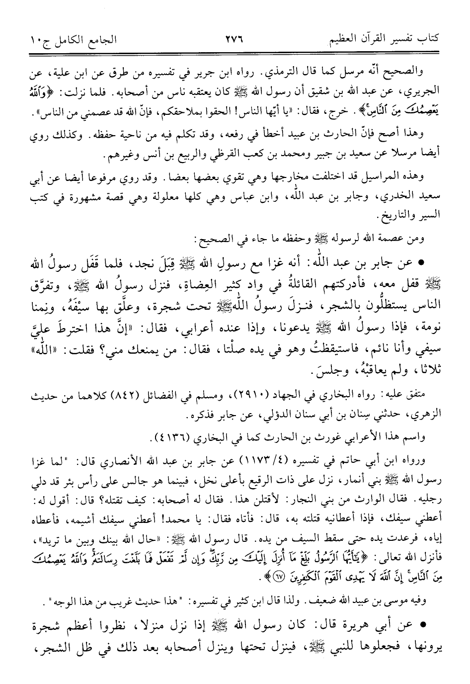 ورواه ابن أبي حاتم في تفسيره (٤/ ١١٧٣) عن جابر بن عبد اللَّه الأنصاري قال: "لما غزا رسول اللَّه -صلى اللَّه عليه وسلم- بني أنمار، نزل على ذات الرقيع بأعلى نخل، فبينما هو جالس على رأس بئر قد دلي رجليه. فقال الوارث من بني النجار: لأقتلن هذا. فقال له أصحابه: كيف تقتله؟ قال: أقول له: أعطني سيفك، فإذا أعطانيه قتلته به، قال: فأتاه فقال: يا محمد! أعطني سيفك أشيمه، فأعطاه إياه، فرعدت يده حتى سقط السيف من يده. قال رسول اللَّه -صلى اللَّه عليه وسلم-: "حال اللَّه بينك وبين ما تريد"، فأنزل اللَّه تعالى: {يَاأَيُّهَا الرَّسُولُ بَلِّغْ مَا أُنْزِلَ إِلَيْكَ مِنْ رَبِّكَ وَإِنْ لَمْ تَفْعَلْ فَمَا بَلَّغْتَ رِسَالَتَهُ وَاللَّهُ يَعْصِمُكَ مِنَ النَّاسِ إِنَّ اللَّهَ لَا يَهْدِي الْقَوْمَ الْكَافِرِينَ (٦٧)}.