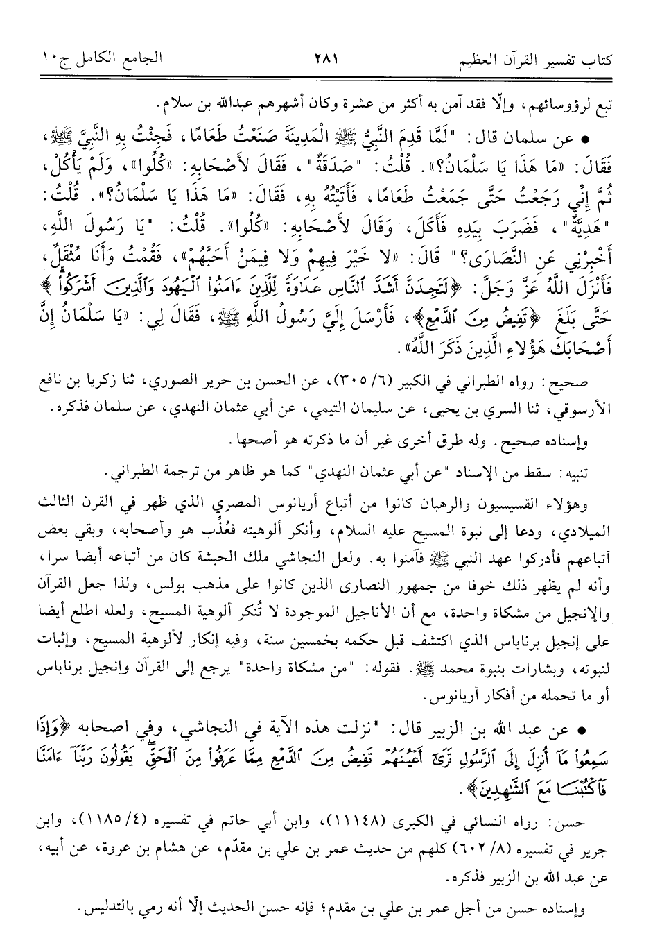 • عن سلمان قال: "لَمَّا قَدِمَ النَّبِيُّ -صلى اللَّه عليه وسلم- الْمَدِينَةَ صَنَعْتُ طَعَامًا، فَجِئْتُ بِهِ النَّبِيَّ -صلى اللَّه عليه وسلم-، فَقَال: "مَا هَذَا يَا سَلْمَانُ؟ ". قُلْتُ: "صَدَقَةٌ"، فَقَال لأَصْحَابِهِ: "كُلُوا"، وَلَمْ يَأْكُلْ، ثُمَّ إِنِّي رَجَعْتُ حَتَّى جَمَعْتُ طَعَامًا، فَأَتَيْتُهُ بِهِ، فَقَال: "مَا هَذَا يَا سَلْمَانُ؟ ". قُلْتُ: "هَدِيَّةٌ"، فَضَرَبَ بِيَدِهِ فَأَكَلَ، وَقَال لأَصْحَابِهِ: "كُلُوا". قُلْتُ: "يَا رَسُول اللَّهِ، أَخْبِرْنِي عَنِ النَّصَارَى؟ " قَال: "لا خَيْرَ فِيهِمْ وَلا فِيمَنْ أَحَبَّهُمْ"، فَقُمْتُ وَأَنَا مُثْقَلٌ، فَأَنْزَل اللَّهُ عزّ وجلّ: {لَتَجِدَنَّ أَشَدَّ النَّاسِ عَدَاوَةً لِلَّذِينَ آمَنُوا الْيَهُودَ وَالَّذِينَ أَشْرَكُوا} حَتَّى بَلَغَ {تَرَى أَعْيُنَهُمْ تَفِيضُ مِنَ الدَّمْعِ}، فَأَرْسَلَ إِلَيَّ رَسُول اللَّهِ -صلى اللَّه عليه وسلم-، فَقَال لِي: "يَا سَلْمَانُ إِنَّ أَصْحَابَكَ هَؤُلاءِ الَّذِينَ ذَكَرَ اللَّهُ".