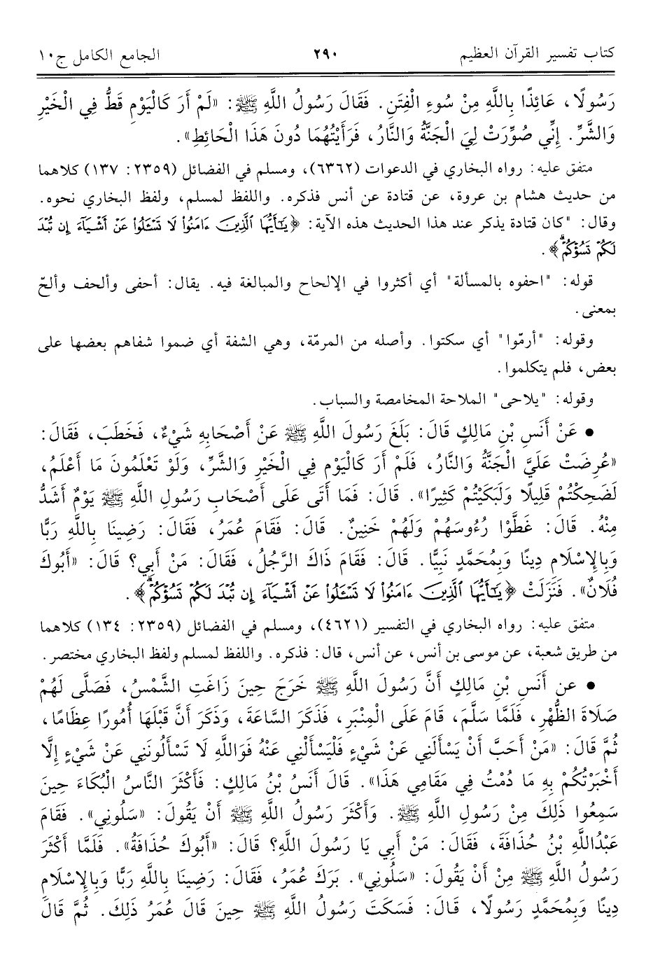 • عَنْ أَنَسِ بْنِ مَالِكٍ قَالَ: بَلَغَ رَسُولَ اللَّهِ -صلى اللَّه عليه وسلم- عَنْ أَصْحَابِهِ شَيْءٌ، فَخَطَبَ، فَقَالَ: "عُرِضَتْ عَلَيَّ الْجَنَّةُ وَالنَّارُ، فَلَمْ أَرَ كَالْيَوْم فِي الْخَيْرِ وَالشَّرِّ، وَلَوْ تَعْلَمُونَ مَا أَعْلَمُ، لَضَحِكْتُمْ قَلِيلًا وَلَبَكَيْتُمْ كَثِيرًا". قَالَ: فَمَا أَتَى عَلَى أَصْحَابِ رَسُولِ اللَّهِ -صلى اللَّه عليه وسلم- يَوْمٌ أَشَدُّ مِنْهُ. قَالَ: غَطَّوْا رُءُوسَهُمْ وَلَهُمْ خَنِينٌ. قَالَ: فَقَامَ عُمَرُ، فَقَالَ: رَضِينَا بِاللَّهِ رَبًّا وَبِالإِسْلَامِ دِينًا وَبِمُحَمَّدٍ نَبِيًّا. قَالَ: فَقَامَ ذَاكَ الرَّجُلُ، فَقَالَ: مَنْ أَبِي؟ قَالَ: "أَبُوكَ فُلَانٌ". فَنَزَلَتْ {يَاأَيُّهَا الَّذِينَ آمَنُوا لَا تَسْأَلُوا عَنْ أَشْيَاءَ إِنْ تُبْدَ لَكُمْ تَسُؤْكُمْ}.