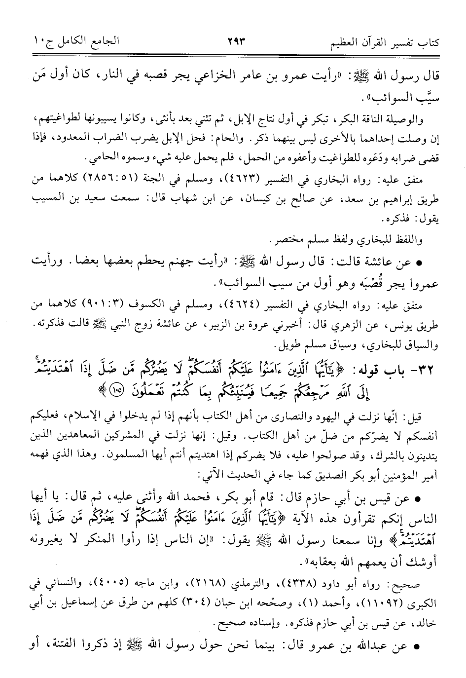• عن عائشة قالت: قال رسول اللَّه -صلى اللَّه عليه وسلم-: "رأيت جهنّم يحطم بعضها بعضًا. ورأيت عمروا يجر قُصْبَه وهو أول من سيب السوائب".