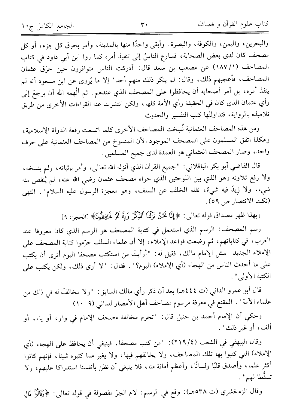 قال القاضي أبو بكر الباقلاني: "جميع القرآن الذي أنزله اللَّه تعالى، وأمر بإثباته، ولم ينسخه، ولا رفع تلاوته وهو الذي بين اللوحتين الذي حواه مصحف عثمان رضي اللَّه عنه، لم يُنقص منه شيء، ولا زِيدَ فيه شيءٌ، نقله الخلف عن السلف، وهو معجزة الرسول عليه السلام". انتهى (نكت الانتصار ص ٥٩).