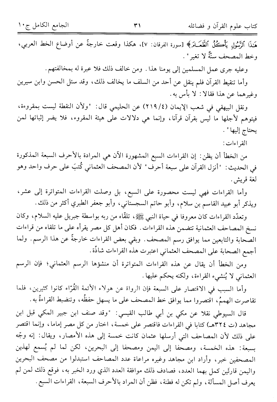 وأما القراءات فهي ليست محصورة على السبع، بل وصلت القراءات المتواترة إلى عشر، ويذكر أبو عبيد القاسم بن سلام، وأبو حاتم السجستاني، وأبو جعفر الطبري أكثر من ذلك.