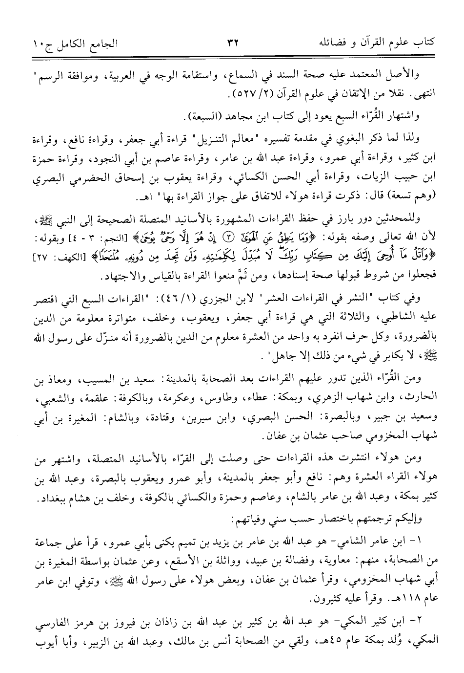 وفي كتاب "النشر في القراءات العشر" لابن الجزري (١/ ٤٦): "القراءات السبع التي اقتصر عليه الشاطبي، والثلاثة التي هي قراءة أبي جعفر، ويعقوب، وخلف، متواترة معلومة من الدين بالضرورة، وكل حرف انفرد به واحد من العشرة معلوم من الدين بالضرورة أنه منزّل على رسول اللَّه -صلى اللَّه عليه وسلم-، لا يكابر في شيء من ذلك إلا جاهل".