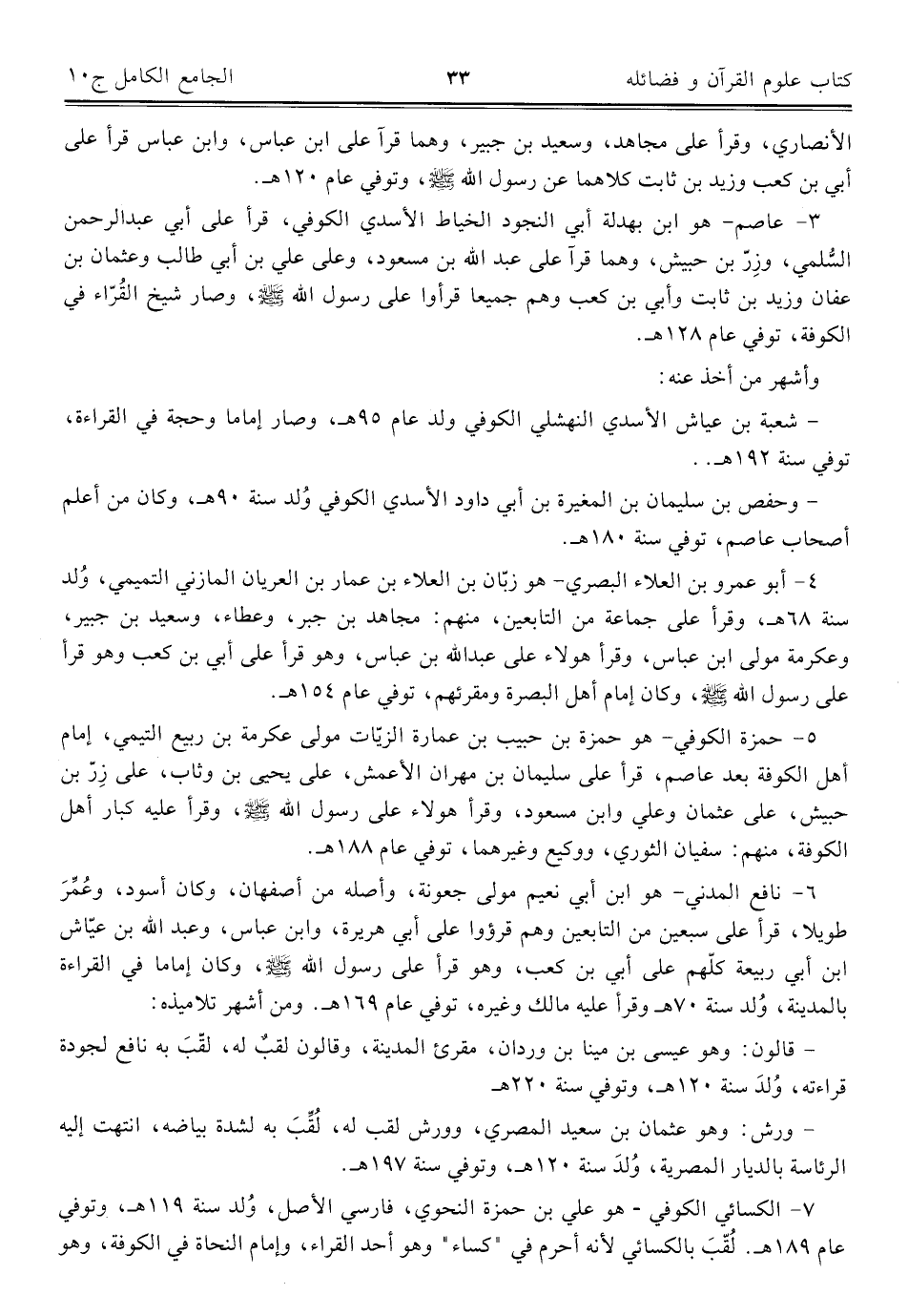 ٤ - أبو عمرو بن العلاء البصري - هو زبّان بن العلاء بن عمار بن العريان المازني التميمي، وُلد سنة ٦٨ هـ، وقرأ على جماعة من التابعين، منهم: مجاهد بن جبر، وعطاء، وسعيد بن جبير، وعكرمة مولى ابن عباس، وقرأ هؤلاء على عبد اللَّه بن عباس، وهو قرأ على أبي بن كعب وهو قرأ على رسول اللَّه -صلى اللَّه عليه وسلم-، وكان إمام أهل البصرة ومقرئهم، توفي عام ١٥٤ هـ.