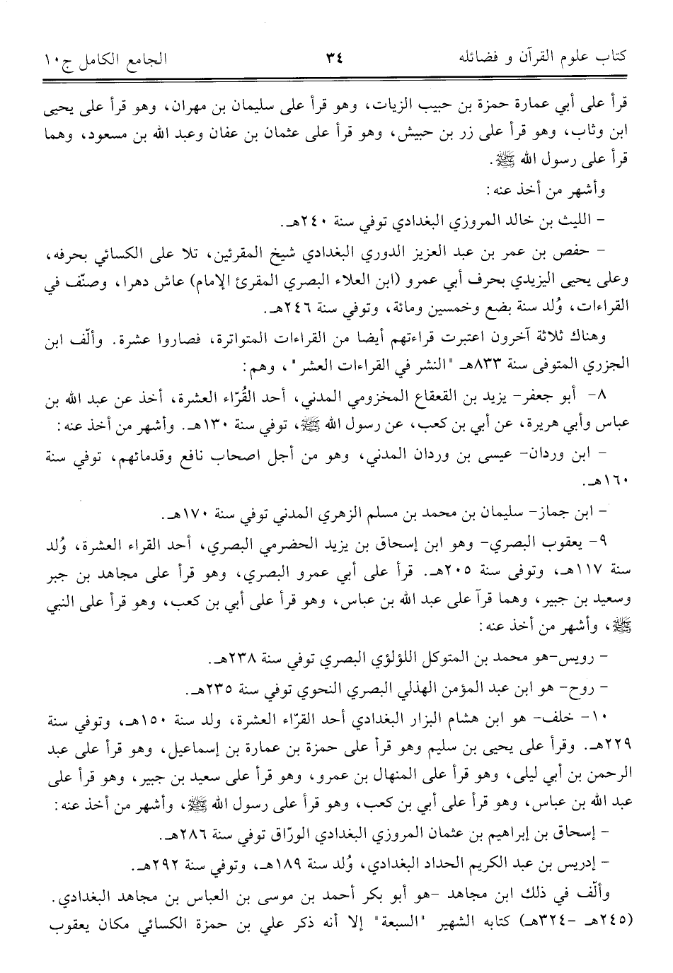 ٩ - يعقوب البصري - وهو ابن إسحاق بن يزيد الحضرمي البصري، أحد القراء العشرة، وُلد سنة ١١٧ هـ، وتوفى سنة ٢٠٥ هـ. قرأ على أبي عمرو البصري، وهو قرأ على مجاهد بن جبر وسعيد بن جبير، وهما قرآ على عبد اللَّه بن عباس، وهو قرأ على أبي بن كعب، وهو قرأ على النبي -صلى اللَّه عليه وسلم-، وأشهر من أخذ عنه:
