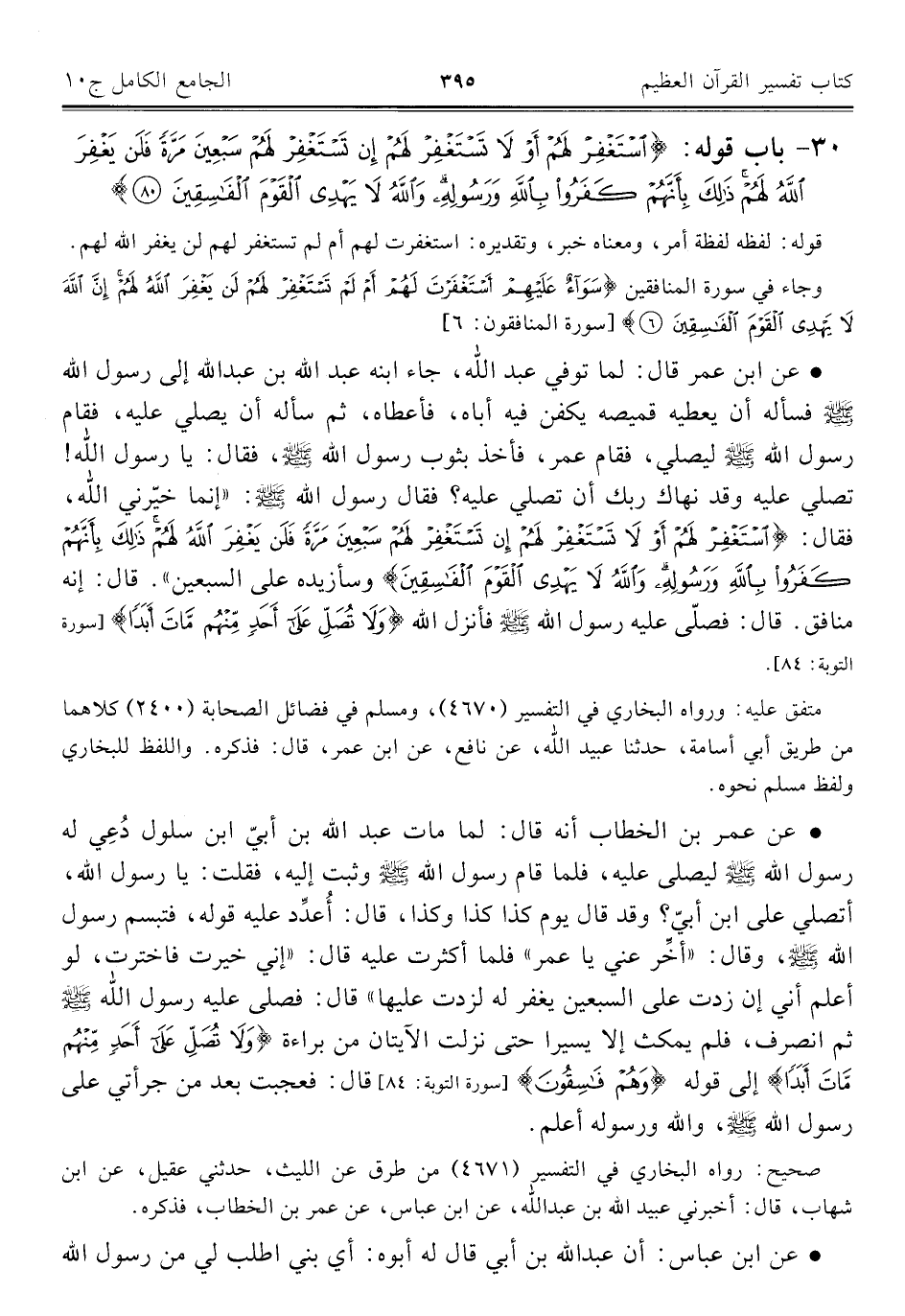 • عن ابن عمر قال: لما توفي عبد الله، جاء ابنه عبد الله بن عبد الله إلى رسول الله - صلى الله عليه وسلم - فسأله أن يعطيه قميصه يكفن فيه أباه، فأعطاه، ثم سأله أن يصلي عليه، فقام رسول الله - صلى الله عليه وسلم - ليصلي، فقام عمر، فأخذ بثوب رسول الله - صلى الله عليه وسلم -، فقال: يا رسول الله! تصلي عليه وقد نهاك ربك أن تصلي عليه؟ فقال رسول الله - صلى الله عليه وسلم -: "إنما خيّرني الله، فقال: {اسْتَغْفِرْ لَهُمْ أَوْ لَا تَسْتَغْفِرْ لَهُمْ إِنْ تَسْتَغْفِرْ لَهُمْ سَبْعِينَ مَرَّةً فَلَنْ يَغْفِرَ اللَّهُ لَهُمْ ذَلِكَ بِأَنَّهُمْ كَفَرُوا بِاللَّهِ وَرَسُولِهِ وَاللَّهُ لَا يَهْدِي الْقَوْمَ الْفَاسِقِينَ} وسأزيده على السبعين". قال: إنه منافق. قال: فصلّى عليه رسول الله - صلى الله عليه وسلم - فأنزل الله {وَلَا تُصَلِّ عَلَى أَحَدٍ مِنْهُمْ مَاتَ أَبَدًا} [سورة التوبة: ٨٤].