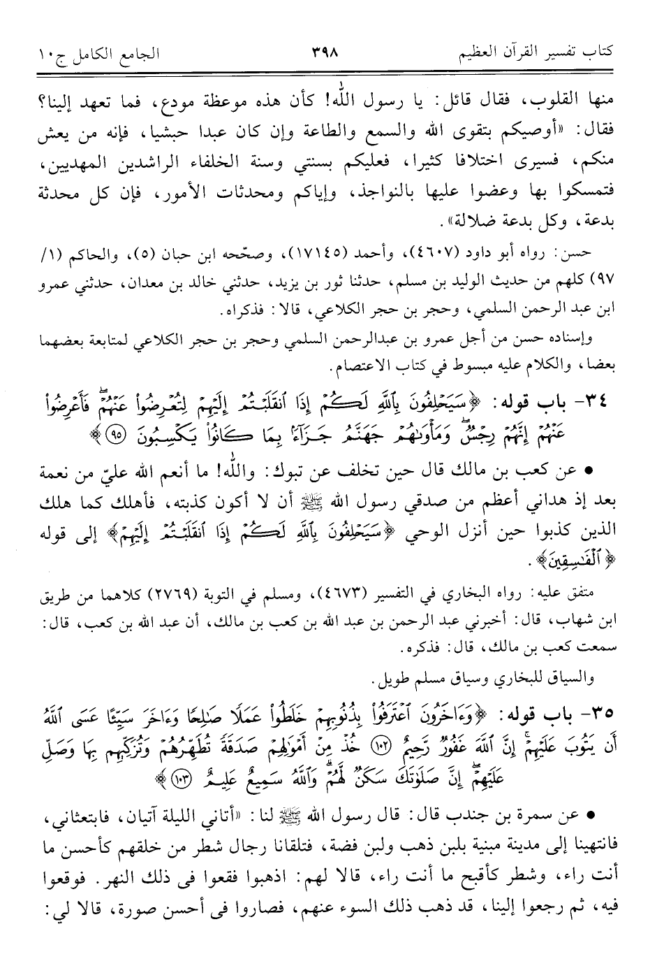 ٣٤ - باب قوله: {سَيَحْلِفُونَ بِاللَّهِ لَكُمْ إِذَا انْقَلَبْتُمْ إِلَيْهِمْ لِتُعْرِضُوا عَنْهُمْ فَأَعْرِضُوا عَنْهُمْ إِنَّهُمْ رِجْسٌ وَمَأْوَاهُمْ جَهَنَّمُ جَزَاءً بِمَا كَانُوا يَكْسِبُونَ (٩٥)}
