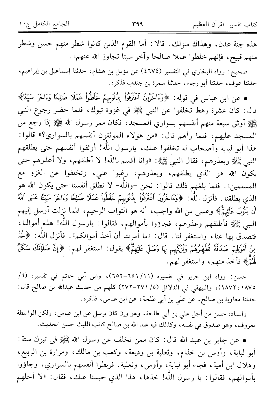 • عن ابن عباس في قوله: {وَآخَرُونَ اعْتَرَفُوا بِذُنُوبِهِمْ خَلَطُوا عَمَلًا صَالِحًا وَآخَرَ سَيِّئًا} قال: كان عشرة رهط تخلفوا عن النبي - صلى الله عليه وسلم - في غزوة تبوك، فلما حضر رجوع النبي - صلى الله عليه وسلم - أوثق سبعة منهم أنفسهم بسواري المسجد، فكان ممر رسول الله - صلى الله عليه وسلم - إذا رجع من المسجد عليهم، فلما رأهم قال: "من هؤلاء الموثقون أنفسهم بالسواري؟ " قالوا: هذا أبو لبابة وأصحاب له تخلفوا عنك، يا رسول الله! أوثقوا أنفسهم حتى يطلقهم النبي - صلى الله عليه وسلم - ويعذرهم، فقال النبي - صلى الله عليه وسلم -: "وأنا أقسم بالله! لا أطلقهم، ولا أعذرهم حتى يكون الله هو الذي يطلقهم، ويعذرهم، رغبوا عني، وتخلفوا عن الغزو مع المسلمين". فلما بلغهم ذلك قالوا: نحن - والله - لا نطلق أنفسنا حتى يكون الله هو الذي يطلقنا. فأنزل الله: {وَآخَرُونَ اعْتَرَفُوا بِذُنُوبِهِمْ خَلَطُوا عَمَلًا صَالِحًا وَآخَرَ سَيِّئًا عَسَى اللَّهُ أَنْ يَتُوبَ عَلَيْهِمْ} وعسى من الله واجب، أنه هو التواب الرحيم، فلما نزلت أرسل إليهم النبي - صلى الله عليه وسلم - فأطلقهم وعذرهم، فجاؤوا بأموالهم، فقالوا: يا رسول الله! هذه أموالنا، فتصدق بها عنا، واستغفر لنا. قال: "ما اُمرت أن آخذ أموالكم". فأنزل الله: {خُذْ مِنْ أَمْوَالِهِمْ صَدَقَةً تُطَهِّرُهُمْ وَتُزَكِّيهِمْ بِهَا وَصَلِّ عَلَيْهِمْ} يقول: استغفر لهم: {إِنَّ صَلَاتَكَ سَكَنٌ لَهُمْ} فأخذ منهم، واستغفر لهم.