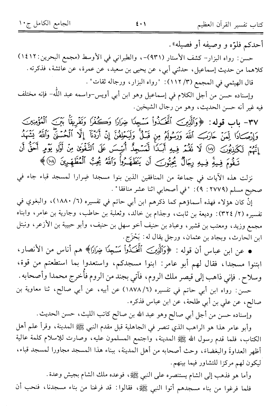 • عن ابن عباس أن قوله: {وَالَّذِينَ اتَّخَذُوا مَسْجِدًا ضِرَارًا} هم أناس من الأنصار، ابتنوا مسجدا، فقال لهم أبو عامر: ابنوا مسجدكم، واستعدوا بما استطعتم من قوة، وسلاح. فإني ذاهب إلى قيصر ملك الروم، فآتي بجند من الروم فأُخرج محمدا وأصحابه.