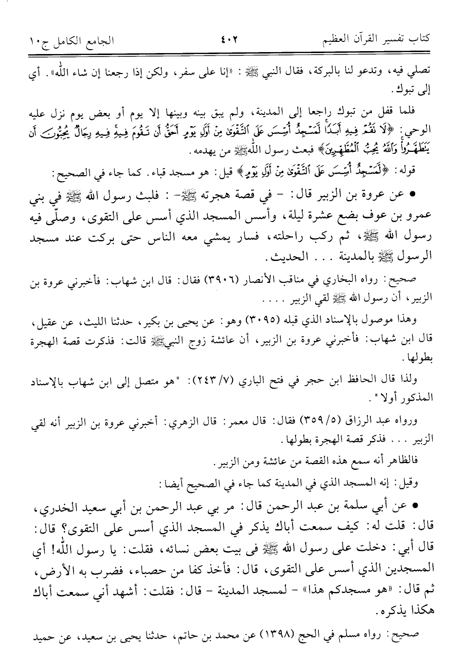 قوله: {لَمَسْجِدٌ أُسِّسَ عَلَى التَّقْوَى مِنْ أَوَّلِ يَوْمٍ} قيل: هو مسجد قباء. كما جاء في الصحيح: