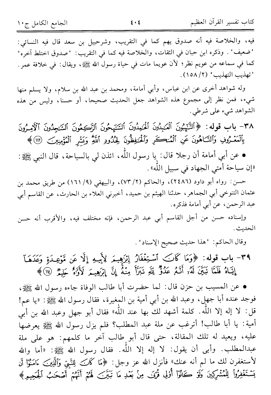 ٣٨ - باب قوله: {التَّائِبُونَ الْعَابِدُونَ الْحَامِدُونَ السَّائِحُونَ الرَّاكِعُونَ السَّاجِدُونَ الْآمِرُونَ بِالْمَعْرُوفِ وَالنَّاهُونَ عَنِ الْمُنْكَرِ وَالْحَافِظُونَ لِحُدُودِ اللَّهِ وَبَشِّرِ الْمُؤْمِنِينَ (١١٢)}