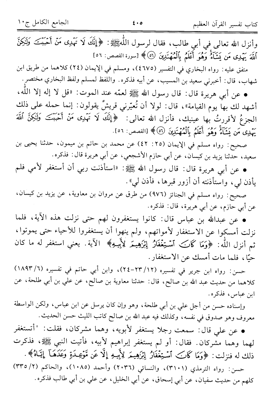 • عن أبي هريرة قال: قال رسول الله - صلى الله عليه وسلم - لعمّه عند الموت: "قل لا إله إلا الله، أشهد لك بها يوم القيامة"، قال: لولا أن تُعيّرني قريشٌ يقولون: إنما حمله على ذلك الجزعُ لأقررتُ بها عينيك، فأنزل الله تعالى: {إِنَّكَ لَا تَهْدِي مَنْ أَحْبَبْتَ وَلَكِنَّ اللَّهَ يَهْدِي مَنْ يَشَاءُ وَهُوَ أَعْلَمُ بِالْمُهْتَدِينَ (٥٦)} [القصص: ٥٦].