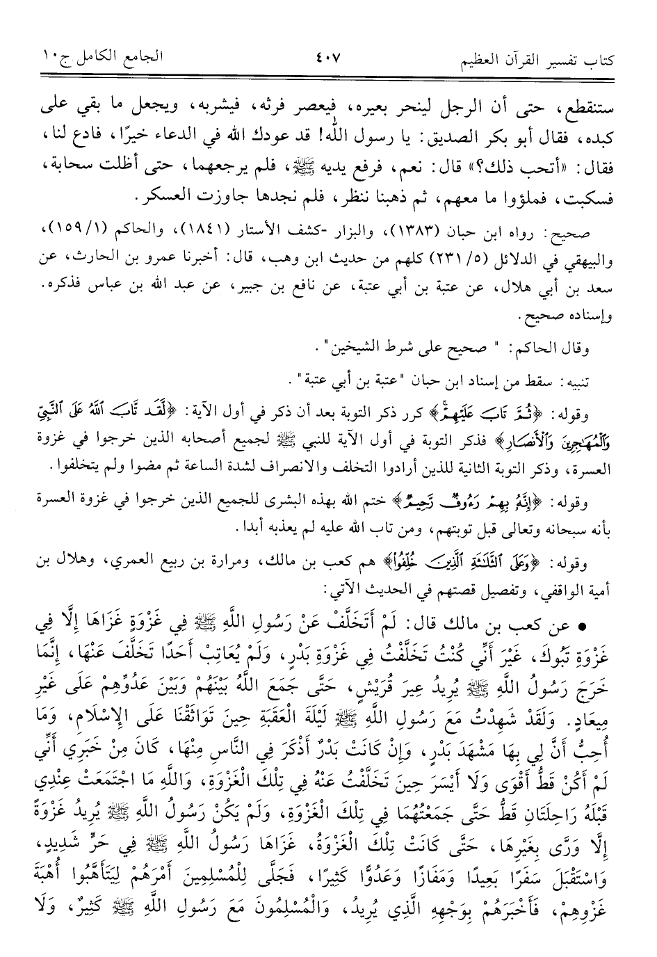 • عن كعب بن مالك قال: لَمْ أَتَخَلَّفْ عَنْ رَسُولِ اللَّهِ - صلى الله عليه وسلم - فِي غَزْوَةٍ غَزَاهَا إِلَّا فِي غَزْوَةِ تَبُوكَ، غَيْرَ أَنِّي كُنْتُ تَخَلَّفْتُ فِي غَزْوَةِ بَدْرٍ، وَلَمْ يُعَاتِبْ أَحَدًا تَخَلَّفَ عَنْهَا، إِنَّمَا خَرَجَ رَسُولُ اللَّهِ - صلى الله عليه وسلم - يُرِيدُ عِيرَ قُرَيْشٍ، حَتَّى جَمَعَ اللَّهُ بَيْنَهُمْ وَبَيْنَ عَدُوِّهِمْ عَلَى غَيْرِ مِيعَادٍ. وَلَقَدْ شَهِدْتُ مَعَ رَسُولِ اللَّهِ - صلى الله عليه وسلم - لَيْلَةَ الْعَقَبَةِ حِينَ تَوَاثَقْنَا عَلَى الإسْلَامِ، وَمَا أُحِبُّ أَنَّ لِي بِهَا مَشْهَدَ بَدْرٍ، وَإِنْ كَانَتْ بَدْرٌ أَذْكَرَ فِي النَّاسِ مِنْهَا، كَانَ مِنْ خَبَرِي أَنِّي لَمْ أَكُنْ قَطُّ أَقْوَى وَلَا أَيْسَرَ حِينَ تَخَلَّفْتُ عَنْهُ فِي تِلْكَ الْغَزْوَةِ، وَاللَّهِ مَا اجْتَمَعَتْ عِنْدِي قَبْلَهُ رَاحِلَتَانِ قَطُّ حَتَّى جَمَعْتُهُمَا فِي تِلْكَ الْغَزْوَةِ، وَلَمْ يَكُنْ رَسُولُ اللَّهِ - صلى الله عليه وسلم - يُرِيدُ غَزْوَةً إِلَّا وَرَّى بِغَيْرِهَا، حَتَّى كَانَتْ تِلْكَ الْغَزْوَةُ، غَزَاهَا رَسُولُ اللَّهِ - صلى الله عليه وسلم - فِي حَرٍّ شَدِيدٍ، وَاسْتَقْبَلَ سَفَرًا بَعِيدًا وَمَفَازًا وَعَدُوًّا كَثِيرًا، فَجَلَّى لِلْمُسْلِمِينَ أَمْرَهُمْ لِيَتَأَهَّبُوا أُهْبَةَ غَزْوِهِمْ، فَأَخْبَرَهُمْ بِوَجْهِهِ الَّذِي يُرِيدُ، وَالْمُسْلِمُونَ مَعَ رَسُولِ اللَّهِ - صلى الله عليه وسلم - كَثِيرٌ، وَلَا