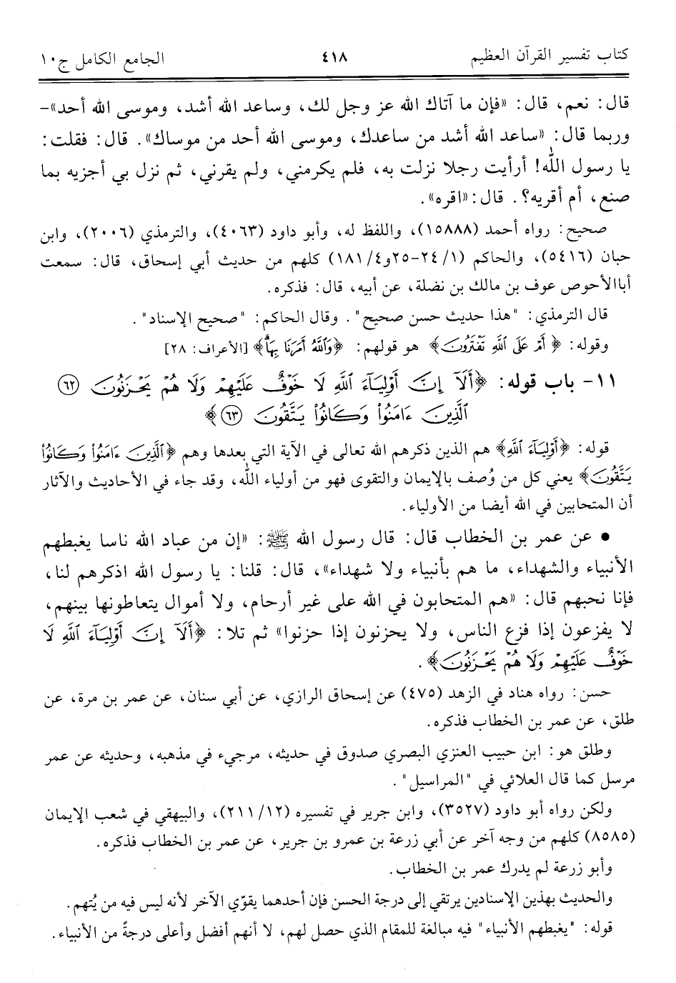 • عن عمر بن الخطاب قال: قال رسول الله - صلى الله عليه وسلم -: "إن من عباد الله ناسا يغبطهم الأنبياء والشهداء، ما هم بأنبياء ولا شهداء"، قال: قلنا: يا رسول الله اذكرهم لنا، فإنا نحبهم قال: "هم المتحابون في الله على غير أرحام، ولا أموال يتعاطونها بينهم، لا يفزعون إذا فزع الناس، ولا يحزنون إذا حزنوا" ثم تلا: {أَلَا إِنَّ أَوْلِيَاءَ اللَّهِ لَا خَوْفٌ عَلَيْهِمْ وَلَا هُمْ يَحْزَنُونَ}.