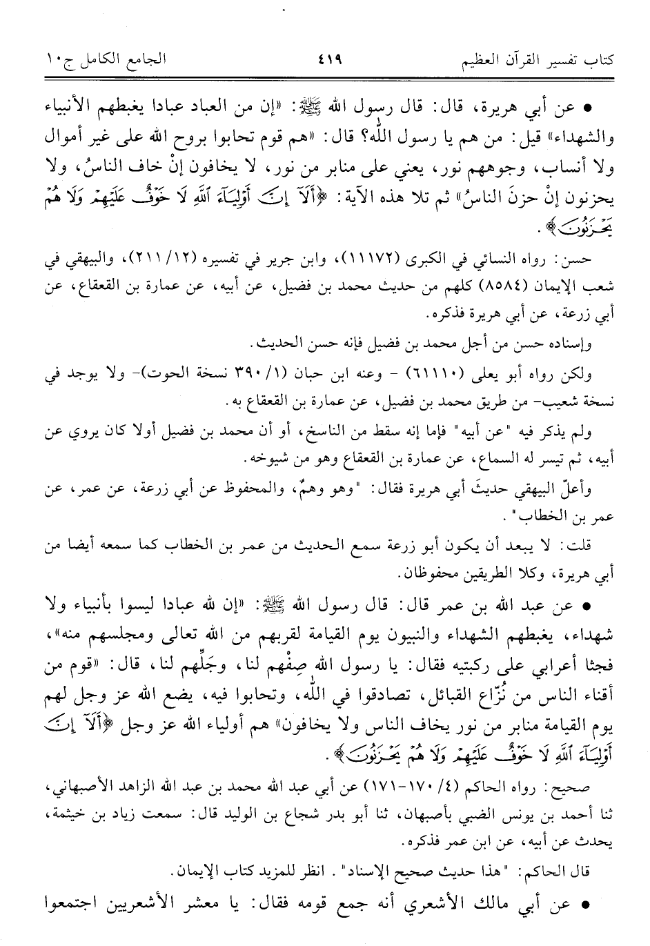• عن أبي هريرة، قال: قال رسول الله - صلى الله عليه وسلم -: "إن من العباد عبادا يغبطهم الأنبياء والشهداء" قيل: من هم يا رسول الله؟ قال: "هم قوم تحابوا بروح الله على غير أموال ولا أنساب، وجوههم نور، يعني على منابر من نور، لا يخافون إنْ خاف الناسُ، ولا يحزنون إنْ حزنَ الناسُ" ثم تلا هذه الآية: {أَلَا إِنَّ أَوْلِيَاءَ اللَّهِ لَا خَوْفٌ عَلَيْهِمْ وَلَا هُمْ يَحْزَنُونَ}.