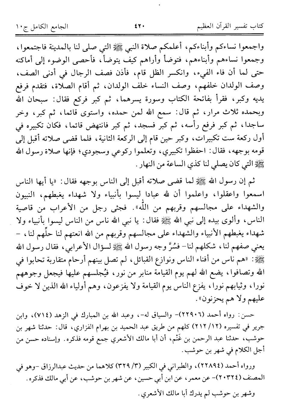 ثم إن رسول الله - صلى الله عليه وسلم - لما قضى صلاته أقبل إلى الناس بوجهه فقال: "يا أيها الناس اسمعوا واعقلوا، واعلموا أن لله عبادا ليسوا بأنبياء ولا شهداء يغبطهم، النبيون والشهداء على مجالسهم وقربهم من الله". فجثى رجل من الأعراب من قاصية الناس، وألوى بيده إلى نبي الله - صلى الله عليه وسلم - فقال: يا نبي الله ناس من الناس ليسوا بأنبياء ولا شهداء يغبطهم الأنبياء والشهداء على مجالسهم وقربهم من الله انعتهم لنا حلِّهم لنا، - يعني صفهم لنا، شكلهم لنا - فسُرَّ وجه رسول الله - صلى الله عليه وسلم - لسؤال الأعرابي، فقال رسول الله - صلى الله عليه وسلم -: "هم ناس من أفناء الناس ونوازع القبائل، لم تصل بينهم أرحام متقاربة تحابوا في الله وتصافوا، يضع الله لهم يوم القيامة منابر من نور، فيُجلسهم عليها فيجعل وجوههم نورا، وثيابهم نورا، يفزع الناس يوم القيامة ولا يفزعون، وهم أولياء الله الذين لا خوف عليهم ولا هم يحزنون".