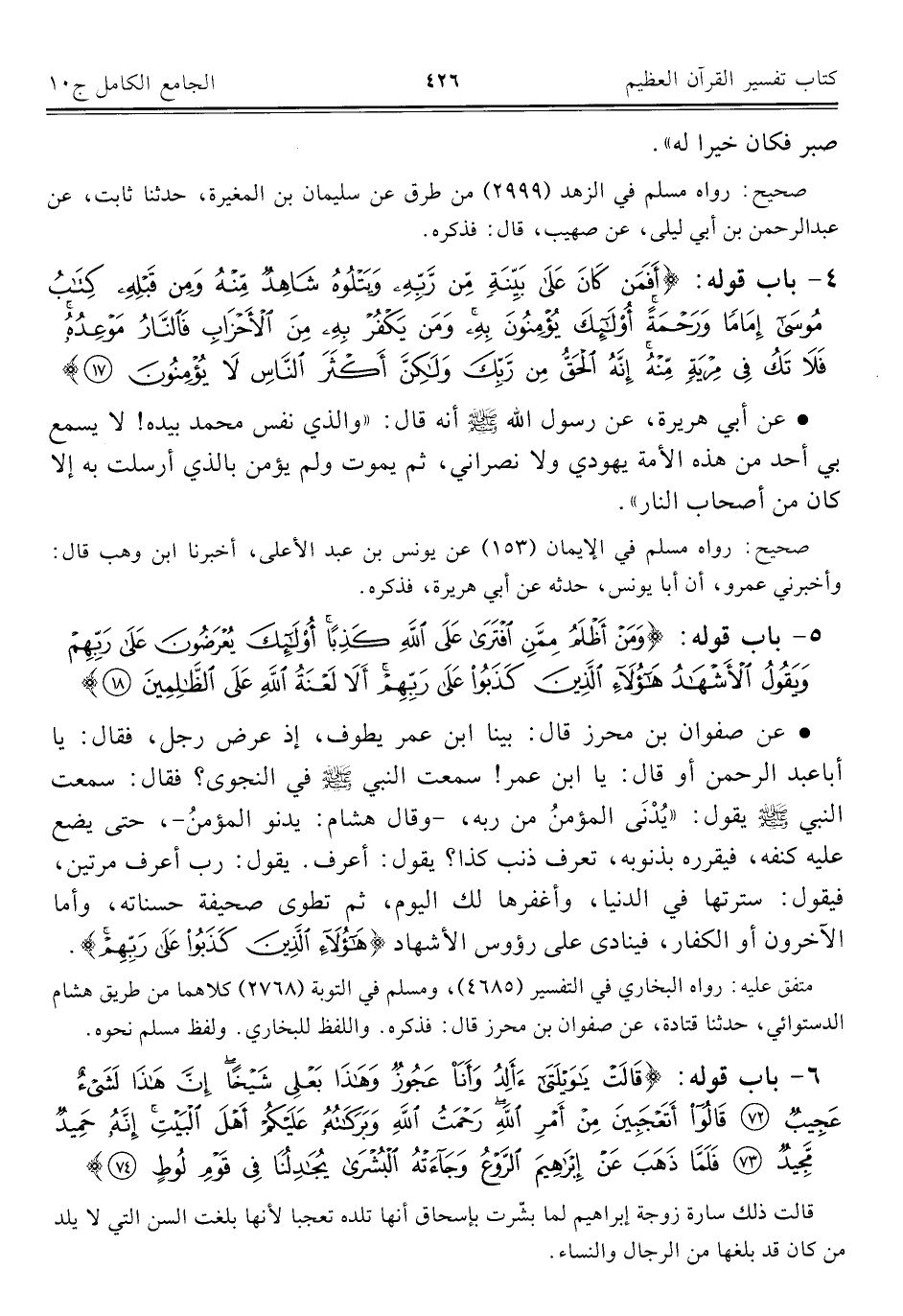 ٤ - باب قوله: {أَفَمَنْ كَانَ عَلَى بَيِّنَةٍ مِنْ رَبِّهِ وَيَتْلُوهُ شَاهِدٌ مِنْهُ وَمِنْ قَبْلِهِ كِتَابُ مُوسَى إِمَامًا وَرَحْمَةً أُولَئِكَ يُؤْمِنُونَ بِهِ وَمَنْ يَكْفُرْ بِهِ مِنَ الْأَحْزَابِ فَالنَّارُ مَوْعِدُهُ فَلَا تَكُ فِي مِرْيَةٍ مِنْهُ إِنَّهُ الْحَقُّ مِنْ رَبِّكَ وَلَكِنَّ أَكْثَرَ النَّاسِ لَا يُؤْمِنُونَ (١٧)}