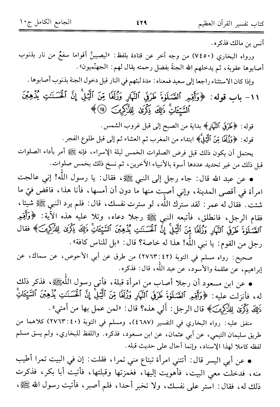 ١١ - باب قوله: {وَأَقِمِ الصَّلَاةَ طَرَفَيِ النَّهَارِ وَزُلَفًا مِنَ اللَّيْلِ إِنَّ الْحَسَنَاتِ يُذْهِبْنَ السَّيِّئَاتِ ذَلِكَ ذِكْرَى لِلذَّاكِرِينَ (١١٤)}