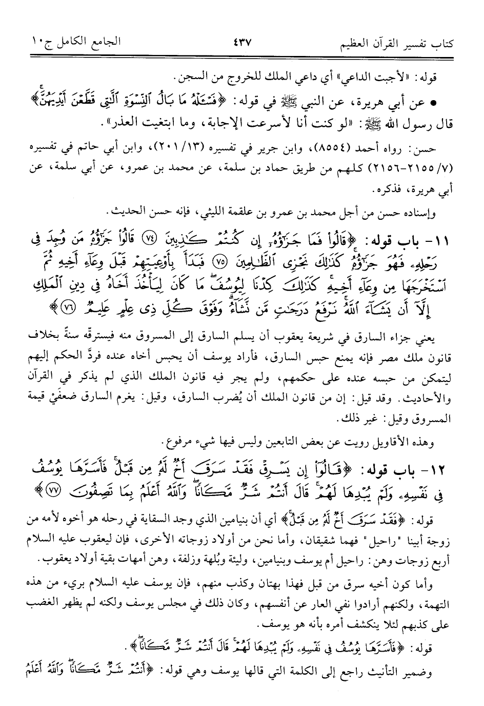 ١١ - باب قوله: {قَالُوا فَمَا جَزَاؤُهُ إِنْ كُنْتُمْ كَاذِبِينَ (٧٤) قَالُوا جَزَاؤُهُ مَنْ وُجِدَ فِي رَحْلِهِ فَهُوَ جَزَاؤُهُ كَذَلِكَ نَجْزِي الظَّالِمِينَ (٧٥) فَبَدَأَ بِأَوْعِيَتِهِمْ قَبْلَ وِعَاءِ أَخِيهِ ثُمَّ اسْتَخْرَجَهَا مِنْ وِعَاءِ أَخِيهِ كَذَلِكَ كِدْنَا لِيُوسُفَ مَا كَانَ لِيَأْخُذَ أَخَاهُ فِي دِينِ الْمَلِكِ إِلَّا أَنْ يَشَاءَ اللَّهُ نَرْفَعُ دَرَجَاتٍ مَنْ نَشَاءُ وَفَوْقَ كُلِّ ذِي عِلْمٍ عَلِيمٌ (٧٦)}