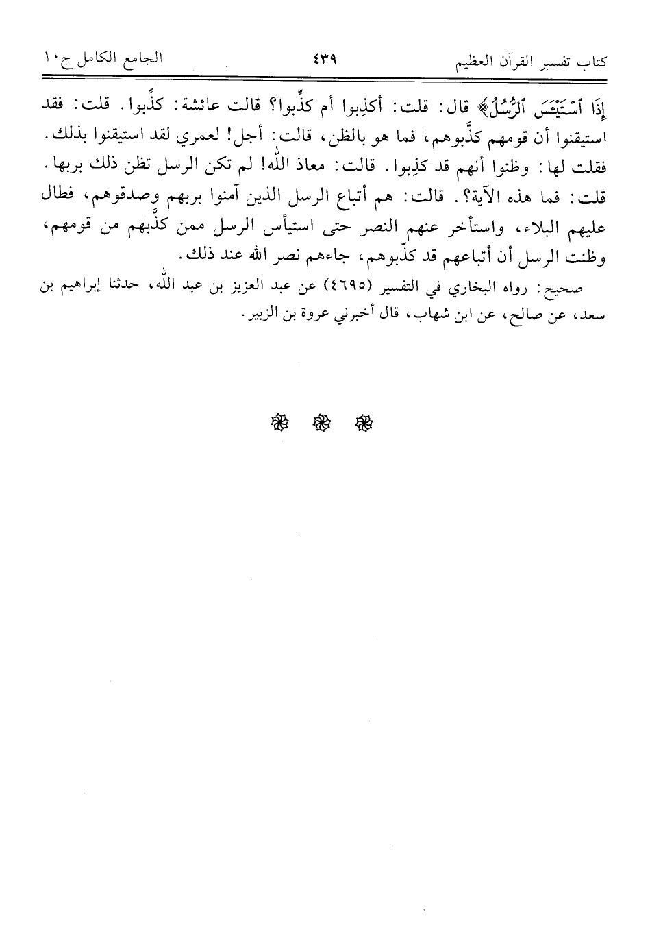 إِذَا اسْتَيْأَسَ الرُّسُلُ} قال: قلت: أكذِبوا أم كذِّبوا؟ قالت عائشة: كذِّبوا. قلت: فقد استيقنوا أن قومهم كذَّبوهم، فما هو بالظن، قالت: أجل! لعمري لقد استيقنوا بذلك. فقلت لها: وظنوا أنهم قد كذِبوا. قالت: معاذ الله! لم تكن الرسل تظن ذلك بربها. قلت: فما هذه الآية؟ . قالت: هم أتباع الرسل الذين آمنوا بربهم وصدقوهم، فطال عليهم البلاء، واستأخر عنهم النصر حتى استيأس الرسل ممن كذّبهم من قومهم، وظنت الرسل أن أتباعهم قد كذّبوهم، جاءهم نصر الله عند ذلك.