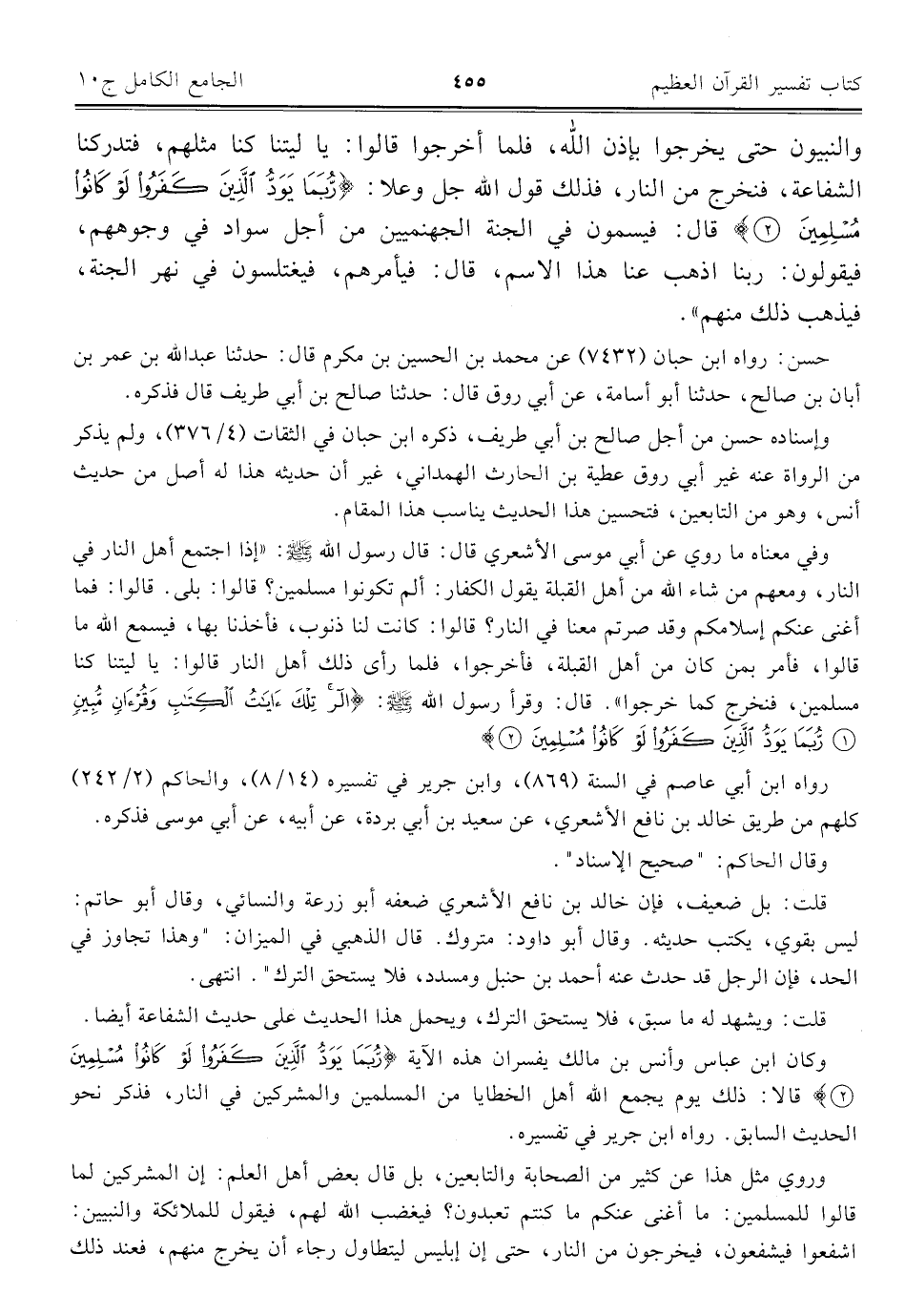 وكان ابن عباس وأنس بن مالك يفسران هذه الآية {رُبَمَا يَوَدُّ الَّذِينَ كَفَرُوا لَوْ كَانُوا مُسْلِمِينَ (٢)} قالا: ذلك يوم يجمع الله أهل الخطايا من المسلمين والمشركين في النار، فذكر نحو الحديث السابق. رواه ابن جرير في تفسيره.