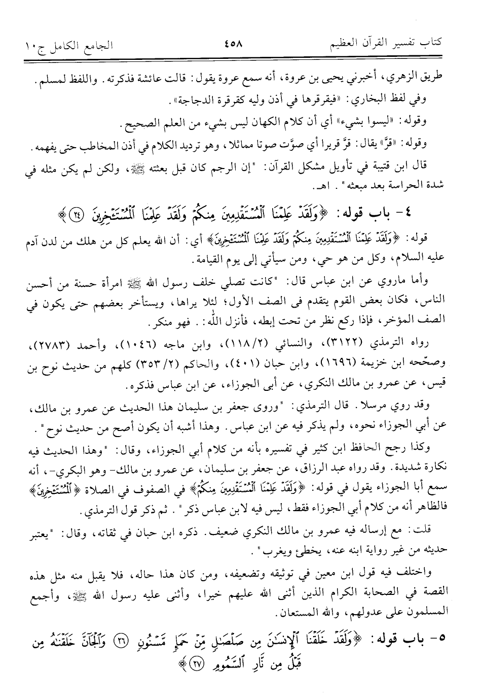 وكذا رجح الحافظ ابن كثير في تفسيره بأنه من كلام أبي الجوزاء، وقال: "وهذا الحديث فيه نكارة شديدة. وقد رواه عبد الرزاق، عن جعفر بن سليمان، عن عمرو بن مالك - وهو البكري -، أنه سمع أبا الجوزاء يقول في قوله: {وَلَقَدْ عَلِمْنَا الْمُسْتَقْدِمِينَ مِنْكُمْ} في الصفوف في الصلاة {الْمُسْتَأْخِرِينَ} فالظاهر أنه من كلام أبي الجوزاء فقط، ليس فيه لابن عباس ذكر". ثم ذكر قول الترمذي.