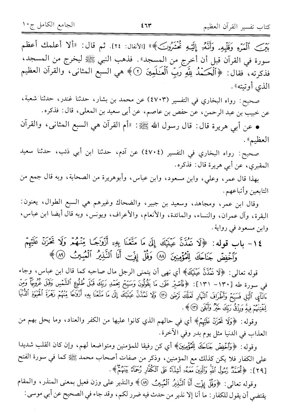 ١٤ - باب قوله: {لَا تَمُدَّنَّ عَيْنَيْكَ إِلَى مَا مَتَّعْنَا بِهِ أَزْوَاجًا مِنْهُمْ وَلَا تَحْزَنْ عَلَيْهِمْ وَاخْفِضْ جَنَاحَكَ لِلْمُؤْمِنِينَ (٨٨) وَقُلْ إِنِّي أَنَا النَّذِيرُ الْمُبِينُ (٨٩)}