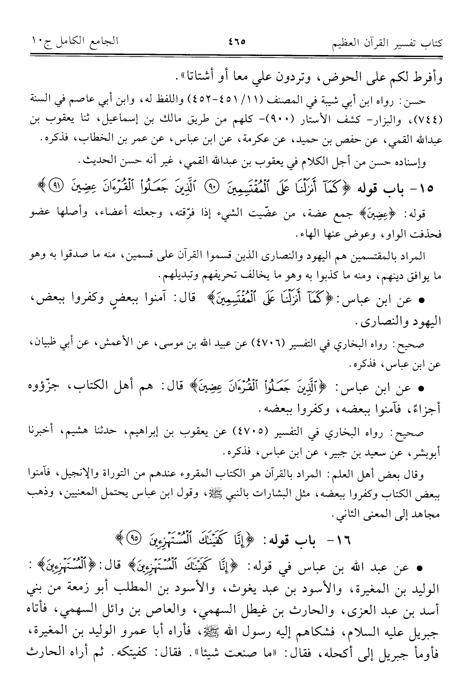 • عن ابن عباس: {الَّذِينَ جَعَلُوا الْقُرْآنَ عِضِينَ} قال: هم أهل الكتاب، جزّؤوه أجزاءً، فآمنوا ببعضه، وكفروا ببعضه.