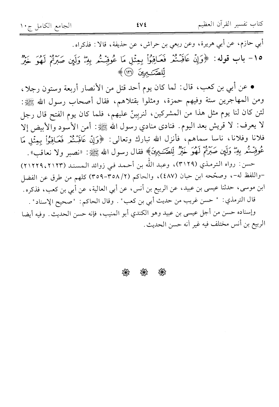 • عن أبي بن كعب، قال: لما كان يوم أحد قتل من الأنصار أربعة وستون رجلا، ومن المهاجرين ستة وفيهم حمزة، ومثلوا بقتلاهم، فقال أصحاب رسول الله - صلى الله عليه وسلم -: لئن كان لنا يوم مثل هذا من المشركين، لنربِينّ عليهم، فلما كان يوم الفتح قال رجل لا يعرف: لا قريش بعد اليوم. فنادى منادي رسول الله - صلى الله عليه وسلم -: أمن الأسود والأبيض إلا فلانا وفلانا، ناسا سماهم، فأنزل الله تبارك وتعالى: {وَإِنْ عَاقَبْتُمْ فَعَاقِبُوا بِمِثْلِ مَا عُوقِبْتُمْ بِهِ وَلَئِنْ صَبَرْتُمْ لَهُوَ خَيْرٌ لِلصَّابِرِينَ (١٢٦)} فقال رسول الله - صلى الله عليه وسلم -: "نصبر ولا نعاقب".