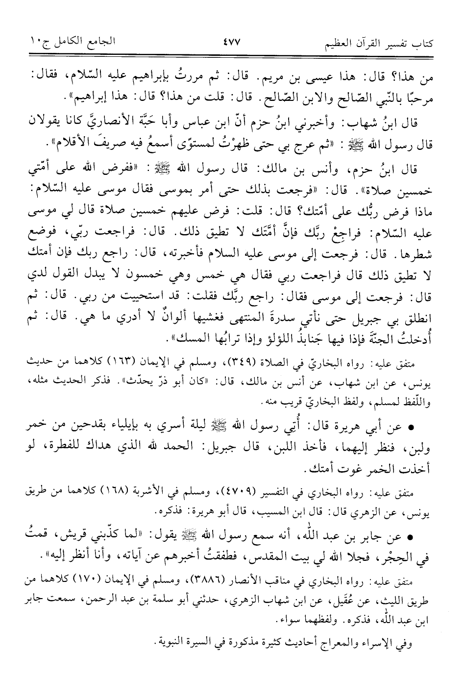 قال ابنُ حزم، وأنس بن مالك: قال رسول الله - صلى الله عليه وسلم -: "ففرض الله على أمّتي خمسين صلاة". قال: "فرجعت بذلك حتى أمر بموسى فقال موسى عليه السّلام: ماذا فرض ربُّك على أمّتك؟ قال: قلت: فرض عليهم خمسين صلاة قال لي موسى عليه السّلام: فراجِعْ ربَّك فإنَّ أمَّتَك لا تطيق ذلك. قال: فراجعت ربّي، فوضع شطرها. قال: فرجعت إلى موسى عليه السلام فأخبرته، قال: راجع ربك فإن أمتك لا تطيق ذلك قال فراجعت ربي فقال هي خمس وهي خمسون لا يبدل القول لدي قال: فرجعت إلى موسى فقال: راجع ربَّك فقلت: قد استحييت من ربي. قال: ثم انطلق بي جبريل حتى نأتي سدرةَ المنتهى فغشيها ألوانٌ لا أدري ما هي. قال: ثم أُدخلتُ الجنّةَ فإذا فيها جَنابذُ اللؤلؤ وإذا ترابُها المسك".