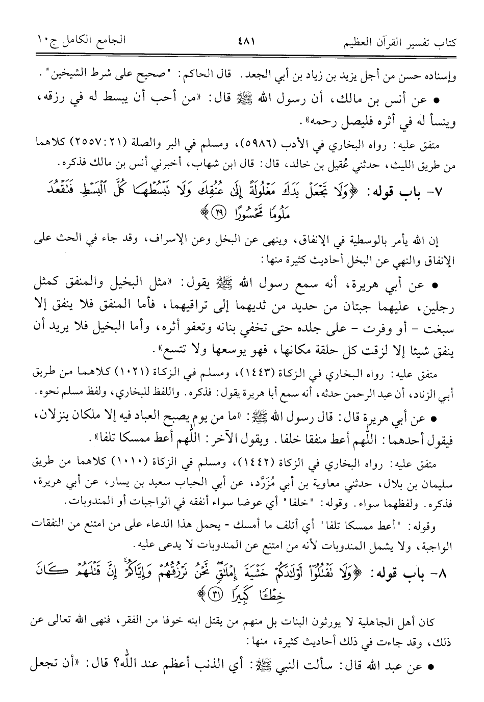 ٧ - باب قوله: {وَلَا تَجْعَلْ يَدَكَ مَغْلُولَةً إِلَى عُنُقِكَ وَلَا تَبْسُطْهَا كُلَّ الْبَسْطِ فَتَقْعُدَ مَلُومًا مَحْسُورًا (٢٩)}