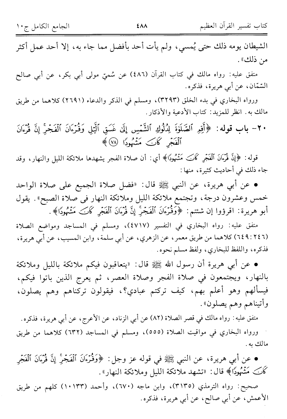 • عن أبي هريرة، عن النبي - صلى الله عليه وسلم - قال: "فضل صلاة الجميع على صلاة الواحد خمس وعشرون درجة، وتجتمعِ ملائكة الليل وملائكة النهار في صلاة الصبح". يقول أبو هريرة: اقرؤوا إن شئتم: {وَقُرْآنَ الْفَجْرِ إِنَّ قُرْآنَ الْفَجْرِ كَانَ مَشْهُودًا (٧٨)}.