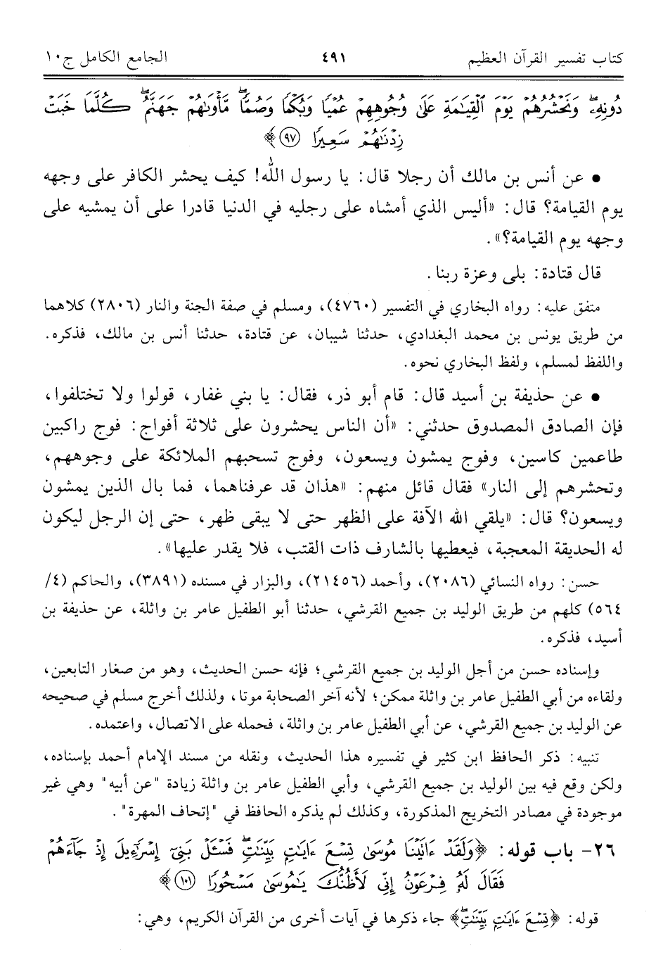 • عن أنس بن مالك أن رجلا قال: يا رسول الله! كيف يحشر الكافر على وجهه يوم القيامة؟ قال: "أليس الذي أمشاه على رجليه في الدنيا قادرا على أن يمشيه على وجهه يوم القيامة؟ ".