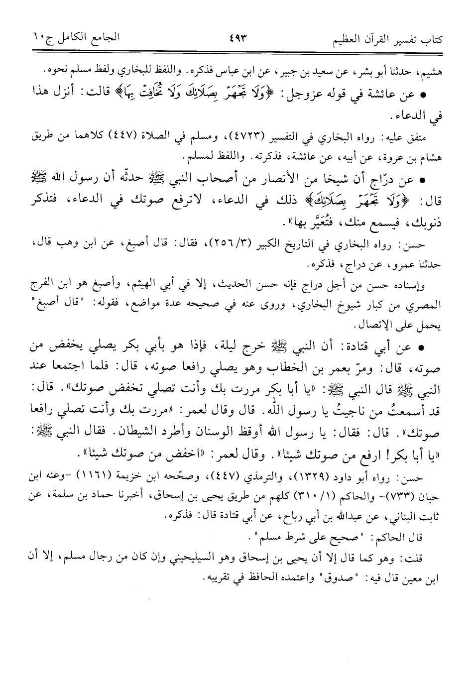• عن درّاج أن شيخا من الأنصار من أصحاب النبي - صلى الله عليه وسلم - حدثّه أن رسول الله - صلى الله عليه وسلم - قال: {وَلَا تَجْهَرْ بِصَلَاتِكَ} ذلك في الدعاء، لا ترفع صوتك في الدعاء، فتذكر ذنوبك، فيسمع منك، فتُعَيَّر بها".