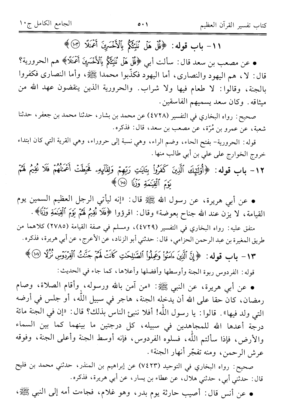 • عن مصعب بن سعد قال: سألت أبي {قُلْ هَلْ نُنَبِّئُكُمْ بِالْأَخْسَرِينَ أَعْمَالًا} هم الحرورية؟ قال: لا، هم اليهود والنصارى، أما اليهود فكذّبوا محمدا - صلى الله عليه وسلم -، وأما النصارى فكفروا بالجنة، وقالوا: لا طعام فيها ولا شراب. والحرورية الذين ينقضون عهد الله من ميثاقه. وكان سعد يسميهم الفاسقين.