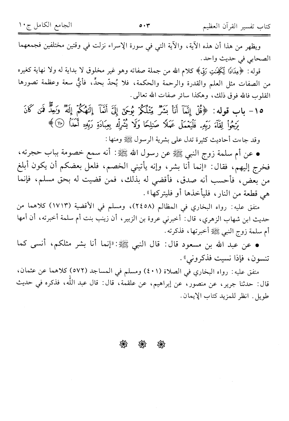 ١٥ - باب قوله: {قُلْ إِنَّمَا أَنَا بَشَرٌ مِثْلُكُمْ يُوحَى إِلَيَّ أَنَّمَا إِلَهُكُمْ إِلَهٌ وَاحِدٌ فَمَنْ كَانَ يَرْجُو لِقَاءَ رَبِّهِ فَلْيَعْمَلْ عَمَلًا صَالِحًا وَلَا يُشْرِكْ بِعِبَادَةِ رَبِّهِ أَحَدًا (١١٠)}