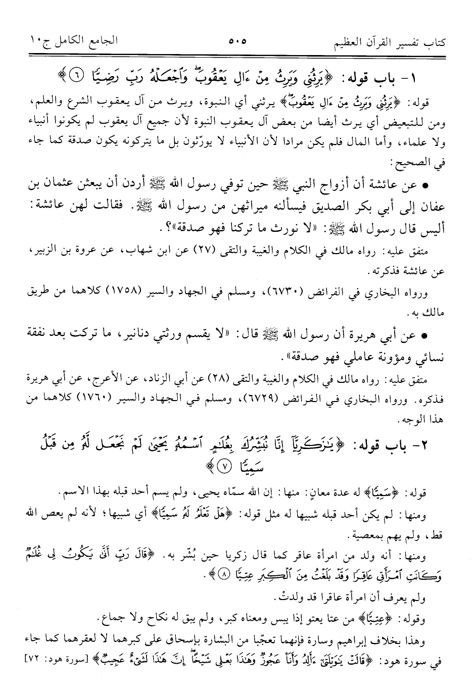 قوله: {يَرِثُنِي وَيَرِثُ مِنْ آلِ يَعْقُوبَ} يرثني أي النبوة، ويرث من آل يعقوب الشرع والعلم، ومن للتبعيض أي يرث أيضا من بعض آل يعقوب النبوة لأن جميع آل يعقوب لم يكونوا أنبياء ولا علماء، وأما المال فلم يكن مرادا لأن الأنبياء لا يورّثون بل ما يتركونه يكون صدقة كما جاء في الصحيح: