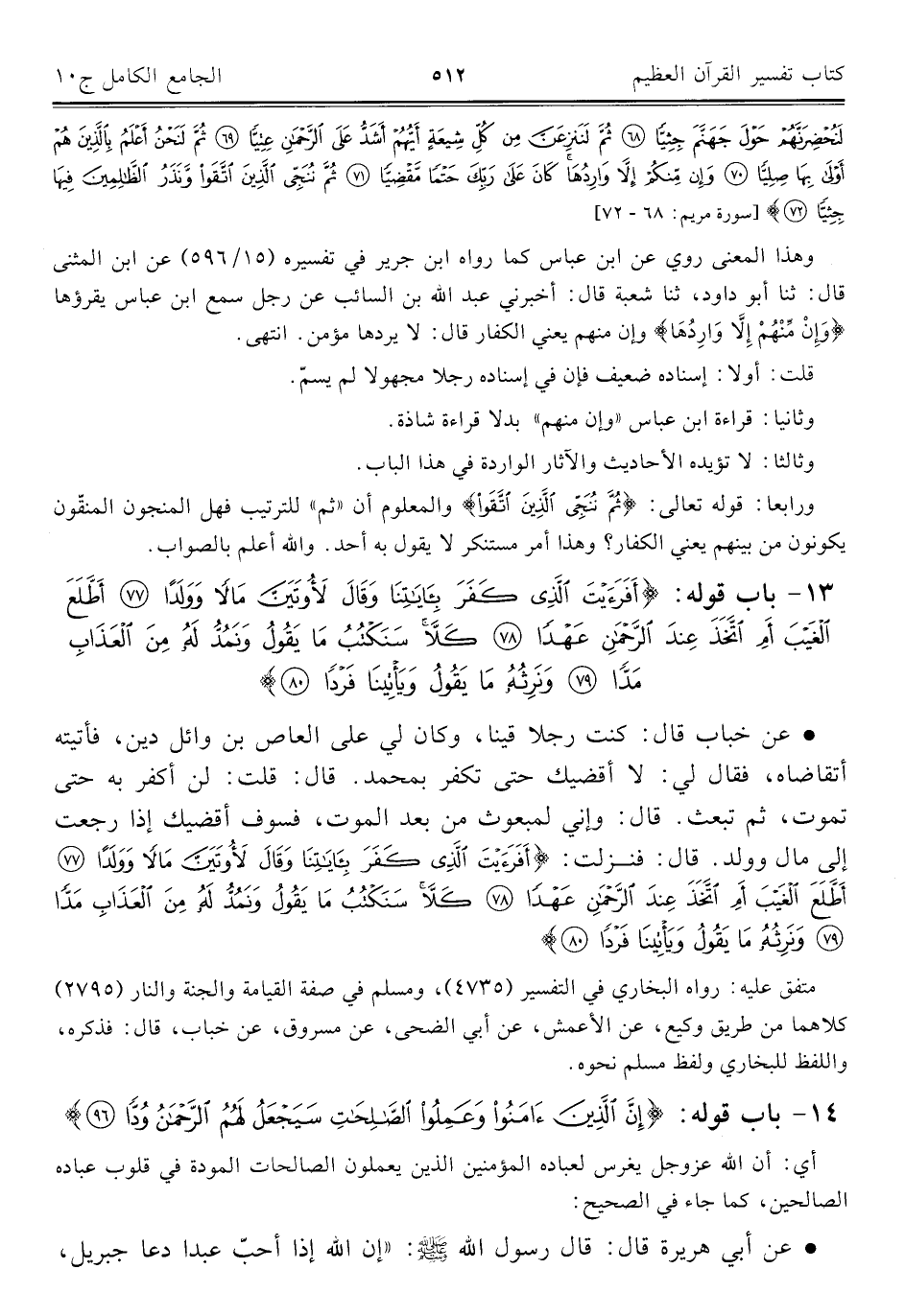 • عن خباب قال: كنت رجلا قينا، وكان لي على العاص بن وائل دين، فأتيته أتقاضاه، فقال لي: لا أقضيك حتى تكفر بمحمد. قال: قلت: لن أكفر به حتى تموت، ثم تبعث. قال: وإني لمبعوث من بعد الموت، فسوف أقضيك إذا رجعت إلى مال وولد. قال: فنزلت: {أَفَرَأَيْتَ الَّذِي كَفَرَ بِآيَاتِنَا وَقَالَ لأُوتَيَنَّ مَالًا وَوَلَدًا (٧٧) أَطَّلَعَ الْغَيْبَ أَمِ اتَّخَذَ عِنْدَ الرَّحْمَنِ عَهْدًا (٧٨) كَلَّا سَنَكْتُبُ مَا يَقُولُ وَنَمُدُّ لَهُ مِنَ الْعَذَابِ مَدًّا (٧٩) وَنَرِثُهُ مَا يَقُولُ وَيَأْتِينَا فَرْدًا (٨٠)}.