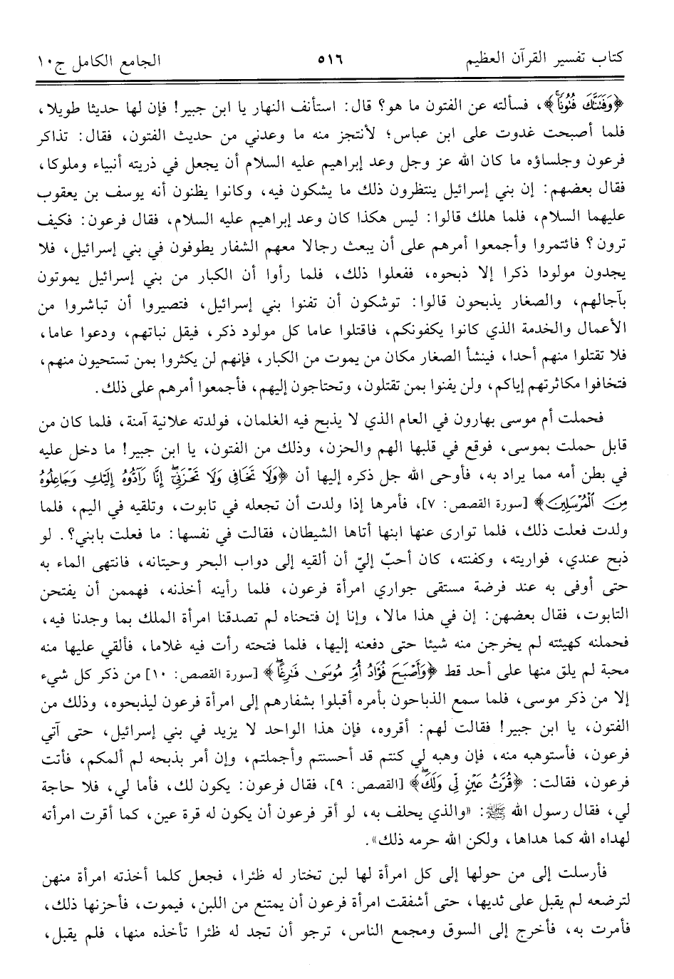 {وَفَتَنَّاكَ فُتُونًا}، فسألته عن الفتون ما هو؟ قال: استأنف النهار يا ابن جبير! فإن لها حديثا طويلا، فلما أصبحت غدوت على ابن عباس؛ لأنتجز منه ما وعدني من حديث الفتون، فقال: تذاكر فرعون وجلساؤه ما كان الله عز وجل وعد إبراهيم عليه السلام أن يجعل في ذريته أنبياء وملوكا، فقال بعضهم: إن بني إسرائيل ينتظرون ذلك ما يشكون فيه، وكانوا يظنون أنه يوسف بن يعقوب عليهما السلام، فلما هلك قالوا: ليس هكذا كان وعد إبراهيم عليه السلام، فقال فرعون: فكيف ترون؟ فائتمروا وأجمعوا أمرهم على أن يبعث رجالا معهم الشفار يطوفون في بني إسرائيل، فلا يجدون مولودا ذكرا إلا ذبحوه، ففعلوا ذلك، فلما رأوا أن الكبار من بني إسرائيل يموتون بآجالهم، والصغار يذبحون قالوا: توشكون أن تفنوا بني إسرائيل، فتصيروا أن تباشروا من الأعمال والخدمة الذي كانوا يكفونكم، فاقتلوا عاما كل مولود ذكر، فيقل نباتهم، ودعوا عاما، فلا تقتلوا منهم أحدا، فينشأ الصغار مكان من يموت من الكبار، فإنهم لن يكثروا بمن تستحيون منهم، فتخافوا مكاثرتهم إياكم، ولن يفنوا بمن تقتلون، وتحتاجون إليهم، فأجمعوا أمرهم على ذلك.