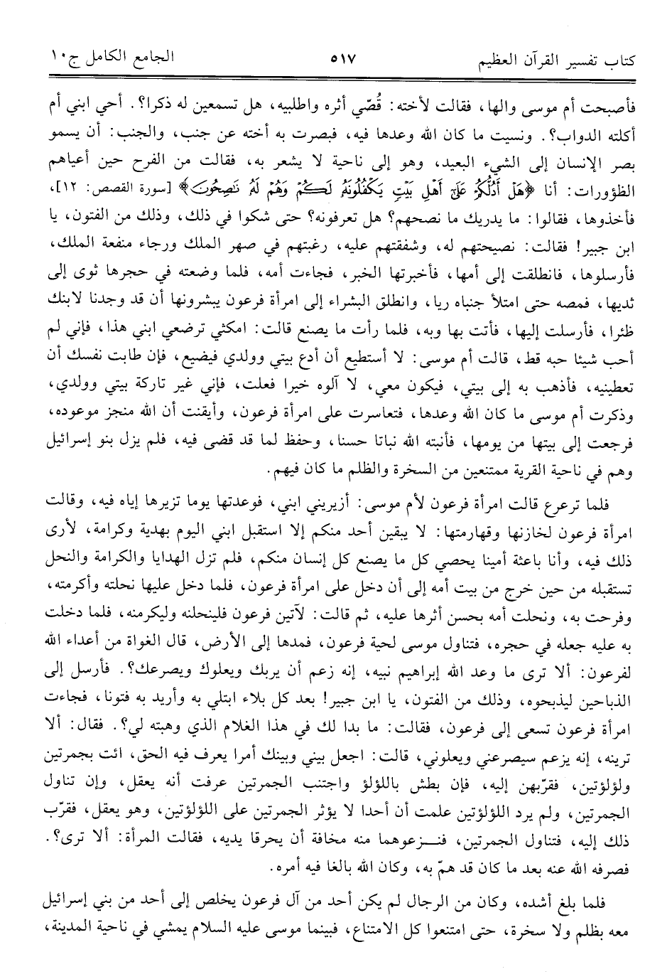 فأصبحت أم موسى والها، فقالت لأخته: قُصّي أثره واطلبيه، هل تسمعين له ذكرا؟ . أحي ابني أم أكلته الدواب؟ . ونسيت ما كان الله وعدها فيه، فبصرت به أخته عن جنب، والجنب: أن يسمو بصر الإنسان إلى الشيء البعيد، وهو إلى ناحية لا يشعر به، فقالت من الفرح حين أعياهم الظؤورات: {هَلْ أَدُلُّكُمْ عَلَى أَهْلِ بَيْتٍ يَكْفُلُونَهُ لَكُمْ وَهُمْ لَهُ نَاصِحُونَ (١٢)} [سورة القصص: ١٢]، فأخذوها، فقالوا: ما يدريك ما نصحهم؟ هل تعرفونه؟ حتى شكوا في ذلك، وذلك من الفتون، يا ابن جبير! فقالت: نصيحتهم له، وشفقتهم عليه، رغبتهم في صهر الملك ورجاء منفعة الملك، فأرسلوها، فانطلقت إلى أمها، فأخبرتها الخبر، فجاءت أمه، فلما وضعته في حجرها ثوى إلى ثديها، فمصه حتى امتلأ جنباه ريا، وانطلق البشراء إلى امرأة فرعون يبشرونها أن قد وجدنا لابنك ظئرا، فأرسلت إليها، فأتت بها وبه، فلما رأت ما يصنع قالت: امكثي ترضعي ابني هذا، فإني لم أحب شيئا حبه قط، قالت أم موسى: لا أستطيع أن أدع بيتي وولدي فيضيع، فإن طابت نفسك أن تعطينيه، فأذهب به إلى بيتي، فيكون معي، لا آلوه خيرا فعلت، فإني غير تاركة بيتي وولدي، وذكرت أم موسى ما كان الله وعدها، فتعاسرت على امرأة فرعون، وأيقنت أن الله منجز موعوده، فرجعت إلى بيتها من يومها، فأنبته الله نباتا حسنا، وحفظ لما قد قضى فيه، فلم يزل بنو إسرائيل وهم في ناحية القرية ممتنعين من السخرة والظلم ما كان فيهم.