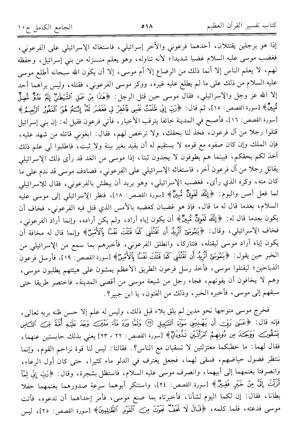 إذا هو برجلين يقتتلان، أحدهما فرعوني والآخر إسرائيلي، فاستغاثه الإسرائيلي على الفرعوني، فغضب موسى عليه السلام غضبا شديدا؛ لأنه تناوله، وهو يعلم منزله من بني إسرائيل، وحفظه لهم، لا يعلم الناس إلا أنما ذلك من الرضاع إلا أم موسى، إلا أن يكون الله سبحانه أطلع موسى عليه السلام من ذلك على ما لم يطلع عليه غيره، ووكز موسى الفرعوني، فقتله، وليس يراهما أحد إلا الله عز وجل والإسرائيلي، فقال موسى حين قتل الرجل: {هَذَا مِنْ عَمَلِ الشَّيْطَانِ إِنَّهُ عَدُوٌّ مُضِلٌّ مُبِينٌ (١٥)} [سورة القصص: ١٥]، ثم قال: {رَبِّ إِنِّي ظَلَمْتُ نَفْسِي فَاغْفِرْ لِي فَغَفَرَ لَهُ إِنَّهُ هُوَ الْغَفُورُ الرَّحِيمُ (١٦)} [سورة القصص: ١٦]، فأصبح في المدينة خائفا يترقب الأخبار، فأتي فرعون فقيل له: إن بني إسرائيل قتلوا رجلا من آل فرعون، فخذ لنا بحقك، ولا ترخص لهم، فقال: ابغوني قاتله من شهد عليه، فإن الملك وإن كان صفوه مع قومه لا يستقيم له أن يقيد بغير بينة ولا ثبت، فاطلبوا لي علم ذلك آخذ لكم بحقكم، فبينما هم يطوفون لا يجدون ثبتا، إذا موسى من الغد قد رأى ذلك الإسرائيلي يقاتل رجلا من آل فرعون آخر، فاستغاثه الإسرائيلي على الفرعوني، فصادف موسى قد ندم على ما كان منه، وكره الذي رأى، فغضب الإسرائيلي، وهو يريد أن يبطش بالفرعوني، فقال للإسرائيلي لما فعل أمس واليوم: {إِنَّكَ لَغَوِيٌّ مُبِينٌ (١٨)} [سورة القصص: ١٨]، فنظر الإسرائيلي إلى موسى عليه السلام، بعدما قال له ما قال، فإذ هو غضبان كغضبه بالأمس الذي قتل فيه الفرعوني، فخاف أن يكون بعدما قال له: {إِنَّكَ لَغَوِيٌّ مُبِينٌ (١٨)} أن يكون إياه أراد، ولم يكن أراده، وإنما أراد الفرعوني، فخاف الإسرائيلي، وقال: {يَامُوسَى أَتُرِيدُ أَنْ تَقْتُلَنِي كَمَا قَتَلْتَ نَفْسًا بِالْأَمْسِ} وإنما قال له مخافة أن يكون إياه أراد موسى ليقتله، فتتاركا، وانطلق الفرعوني، فأخبرهم بما سمع من الإسرائيلي من الخبر حين يقول: {يَامُوسَى أَتُرِيدُ أَنْ تَقْتُلَنِي كَمَا قَتَلْتَ نَفْسًا بِالْأَمْسِ} [سورة القصص: ١٩]، فأرسل فرعون الذباحين؛ ليقتلوا موسى، فأخذ رسل فرعون الطريق الأعظم يمشون على هيئتهم يطلبون موسى، وهم لا يخافون أن يفوتهم، فجاء رجل من شيعة موسى من أقصى المدينة، فاختصر طريقا حتى سبقهم إلى موسى، فأخبره الخبر، وذلك من الفتون، يا ابن جبير؟ .
