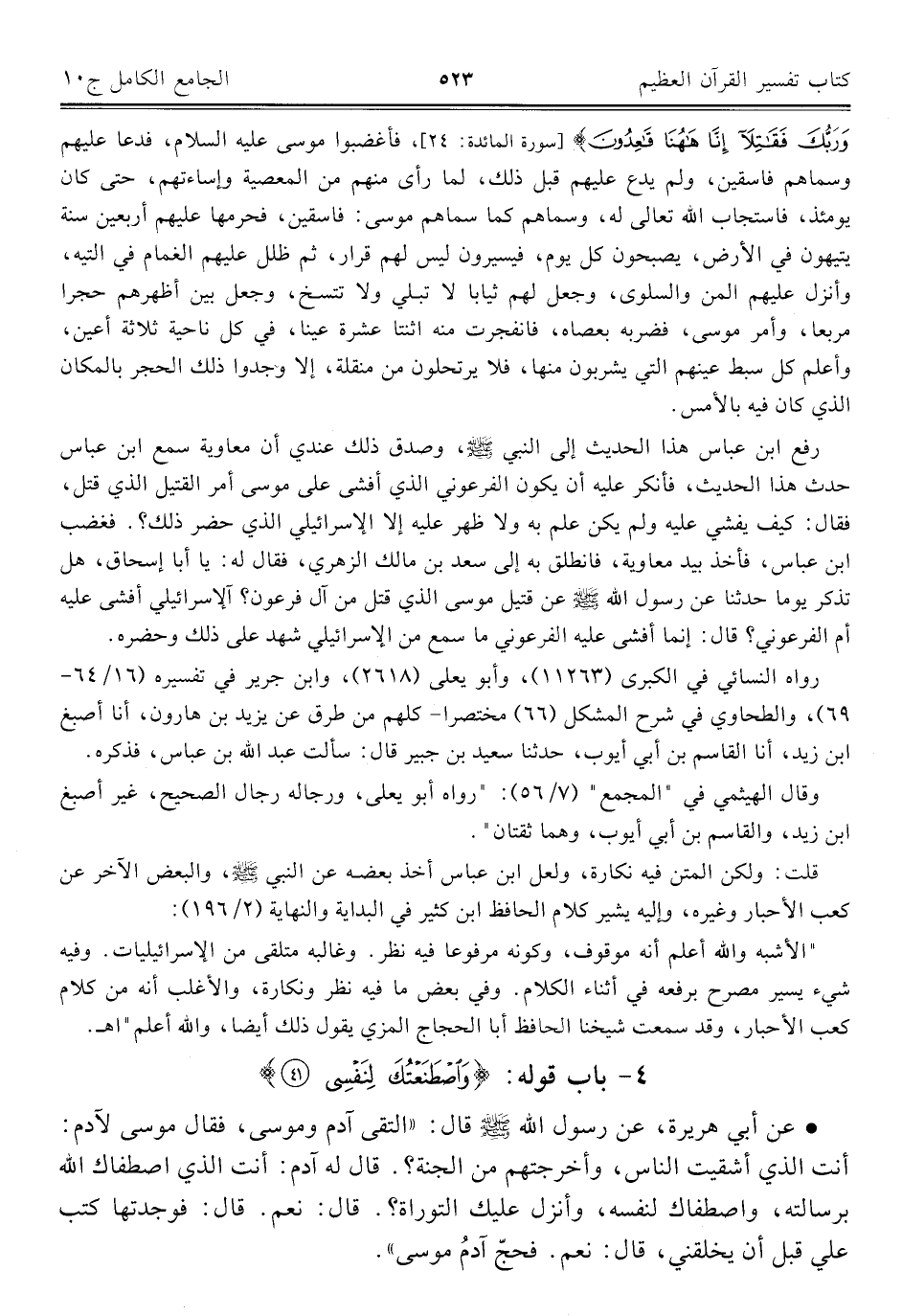 رفع ابن عباس هذا الحديث إلى النبي - صلى الله عليه وسلم -، وصدق ذلك عندي أن معاوية سمع ابن عباس حدث هذا الحديث، فأنكر عليه أن يكون الفرعوني الذي أفشى على موسى أمر القتيل الذي قتل، فقال: كيف يفشي عليه ولم يكن علم به ولا ظهر عليه إلا الإسرائيلي الذي حضر ذلك؟ . فغضب ابن عباس، فأخذ بيد معاوية، فانطلق به إلى سعد بن مالك الزهري، فقال له: يا أبا إسحاق، هل تذكر يوما حدثنا عن رسول الله - صلى الله عليه وسلم - عن قتيل موسى الذي قتل من آل فرعون؟ آلإسرائيلي أفشى عليه أم الفرعوني؟ قال: إنما أفشى عليه الفرعوني ما سمع من الإسرائيلي شهد على ذلك وحضره.