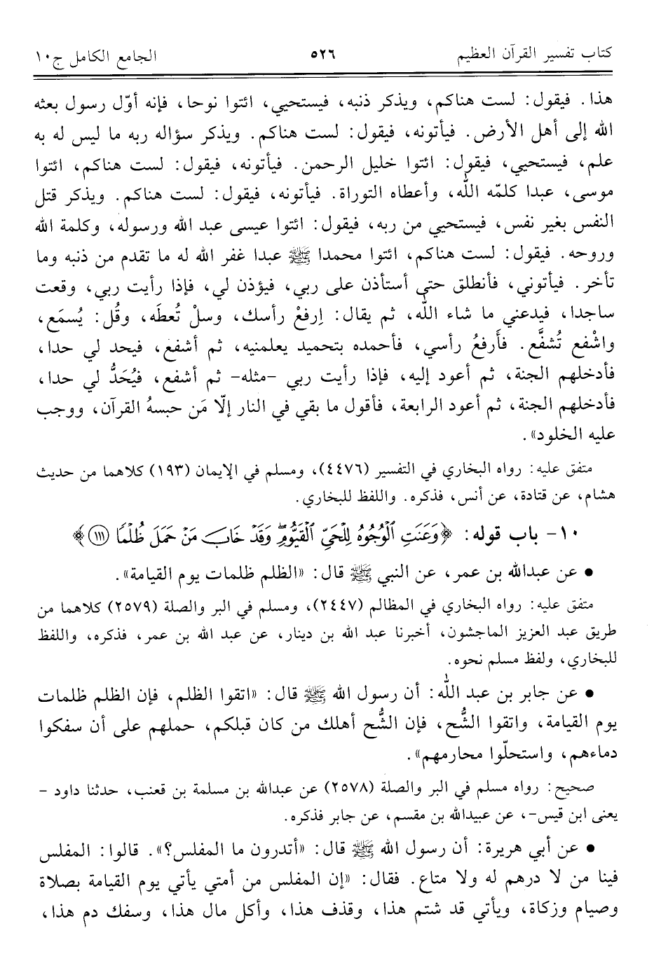 ١٠ - باب قوله: {وَعَنَتِ الْوُجُوهُ لِلْحَيِّ الْقَيُّومِ وَقَدْ خَابَ مَنْ حَمَلَ ظُلْمًا (١١١)}